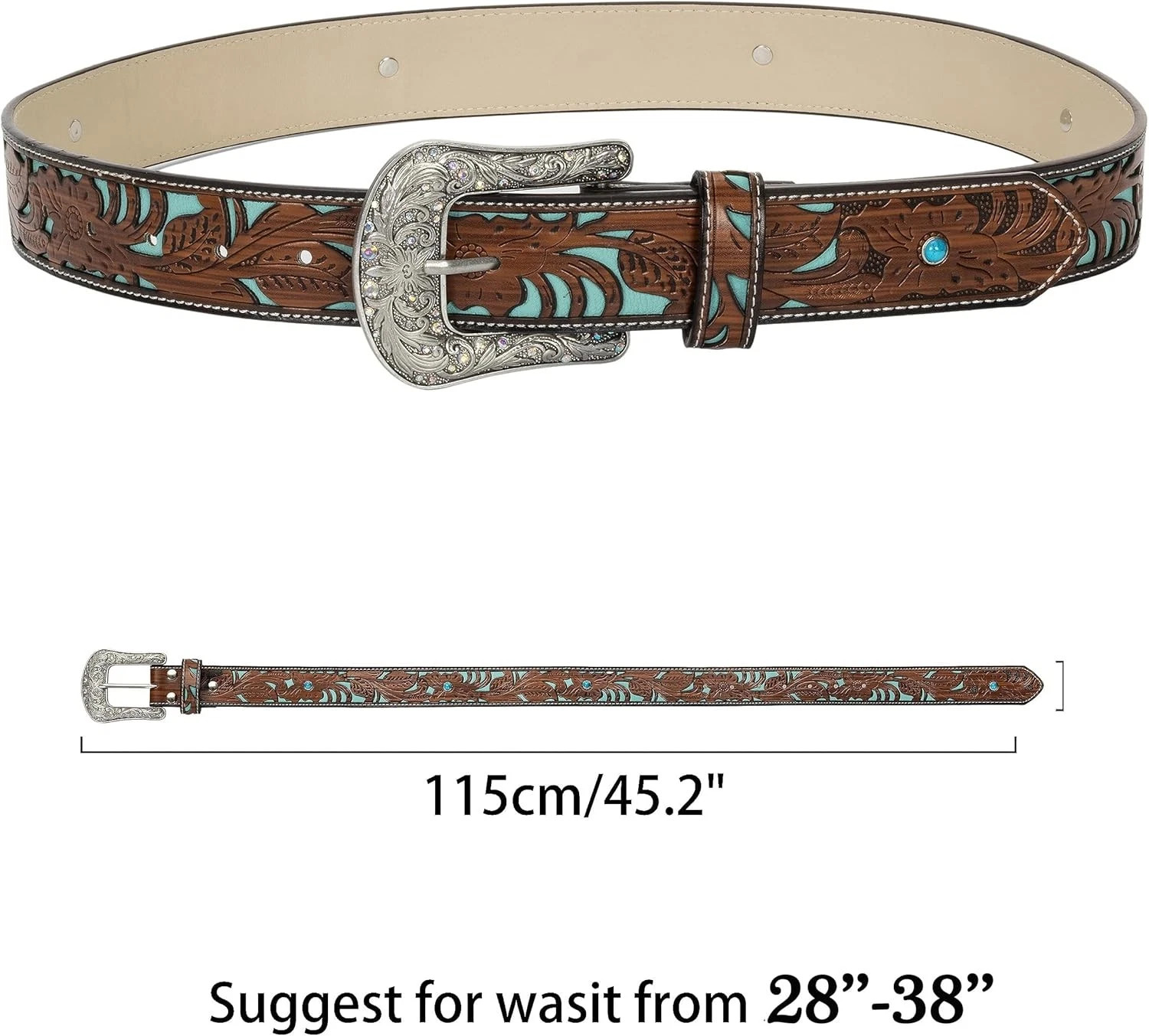 Western-Belts for Women, Men-Belt with Rhinestone Buckle-Belts, Turquoise Carved