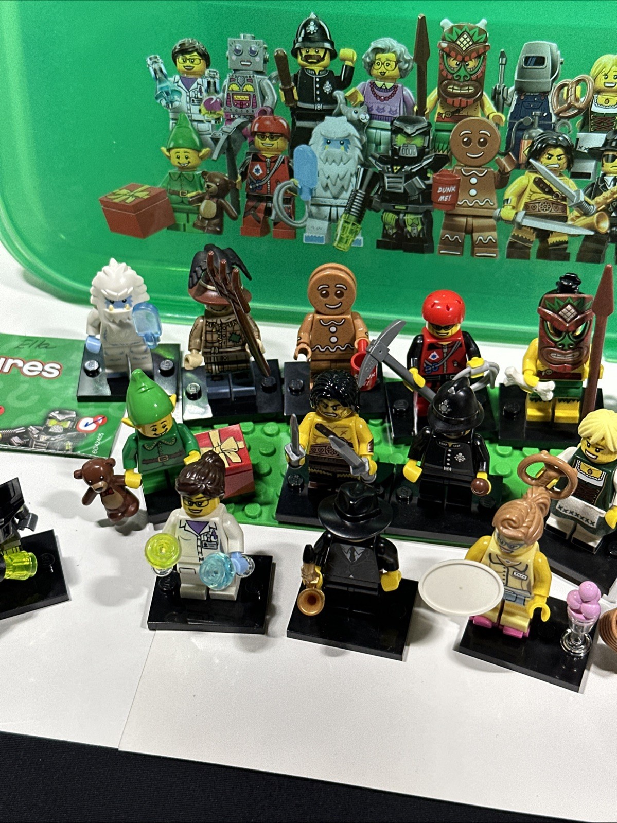 LEGO Character: Barbarian, Constable, Diner Waitress, Evil Mech, Female Research Scientist, Gingerbread Man, Grandma, Holiday Elf, Island Warrior, Lady Robot, Mountain Climber, Pretzel Girl, Saxophone Player, Scarecrow, Welder, Yeti