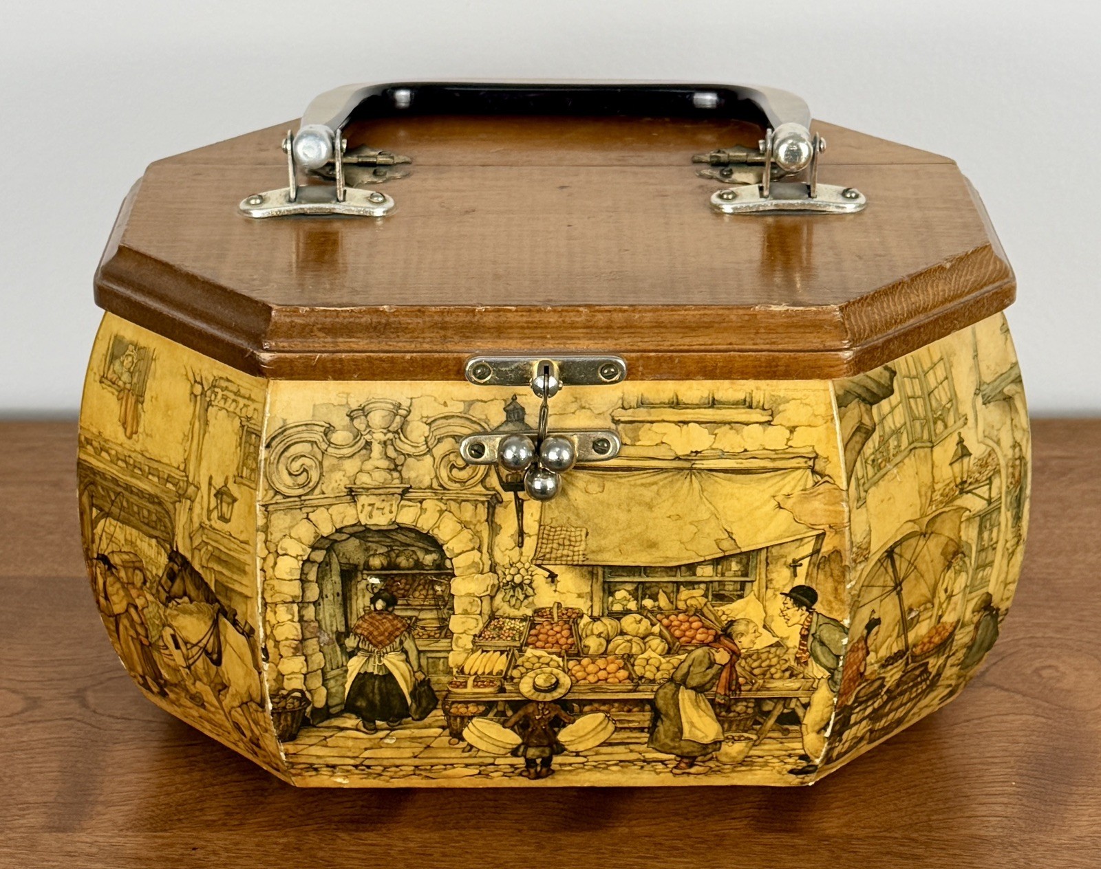 Vintage 1960s Anton Pieck Decoupage Wooden Box Purse Octagonal Lucite Handle