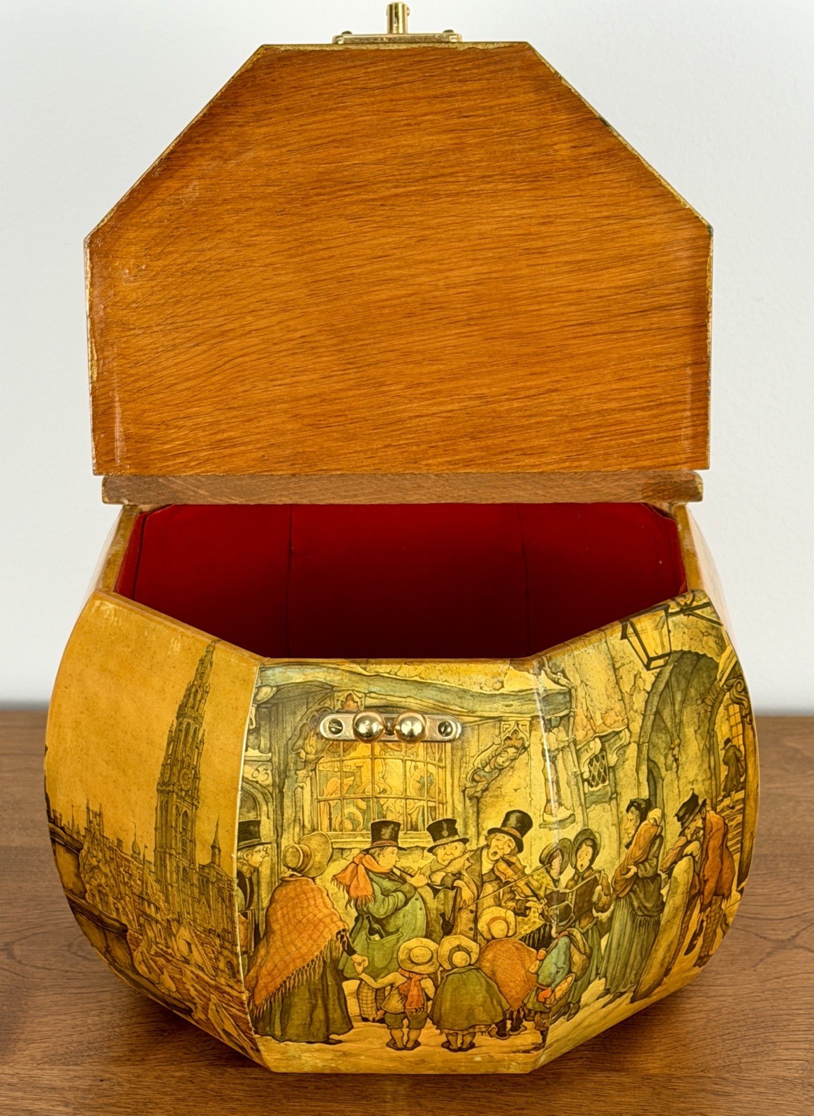 как выглядит Vintage 60s Anton Pieck Holiday Scenes Decoupage Wooden Box Purse Lucite Handle фото