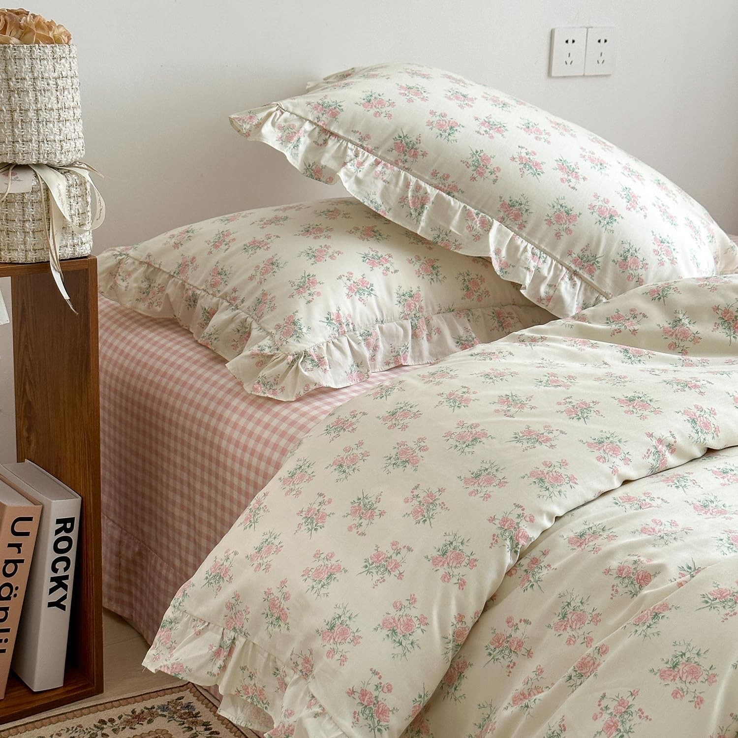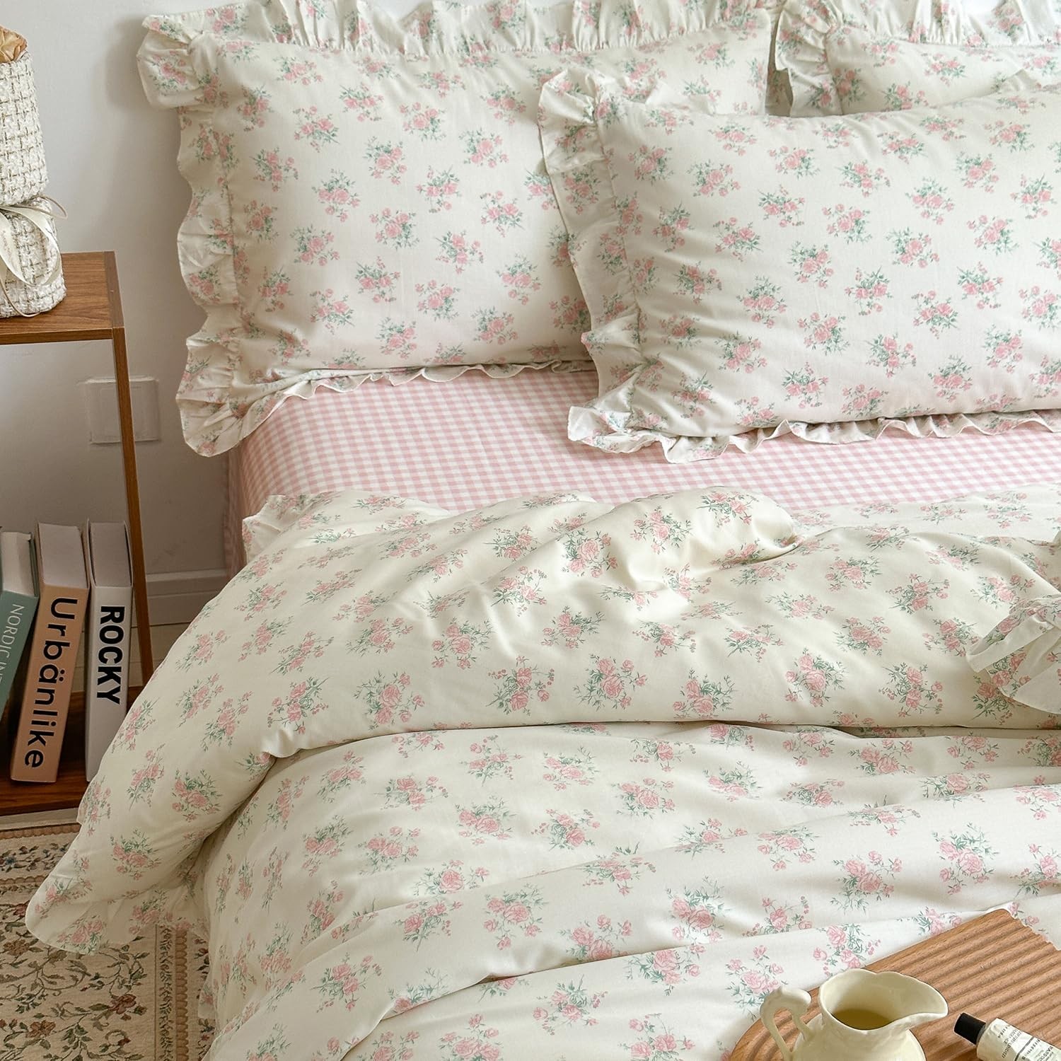 Floral Duvet Cover Set for Girls 100 Cotton Ruffled Bedding with Pink Blosso...