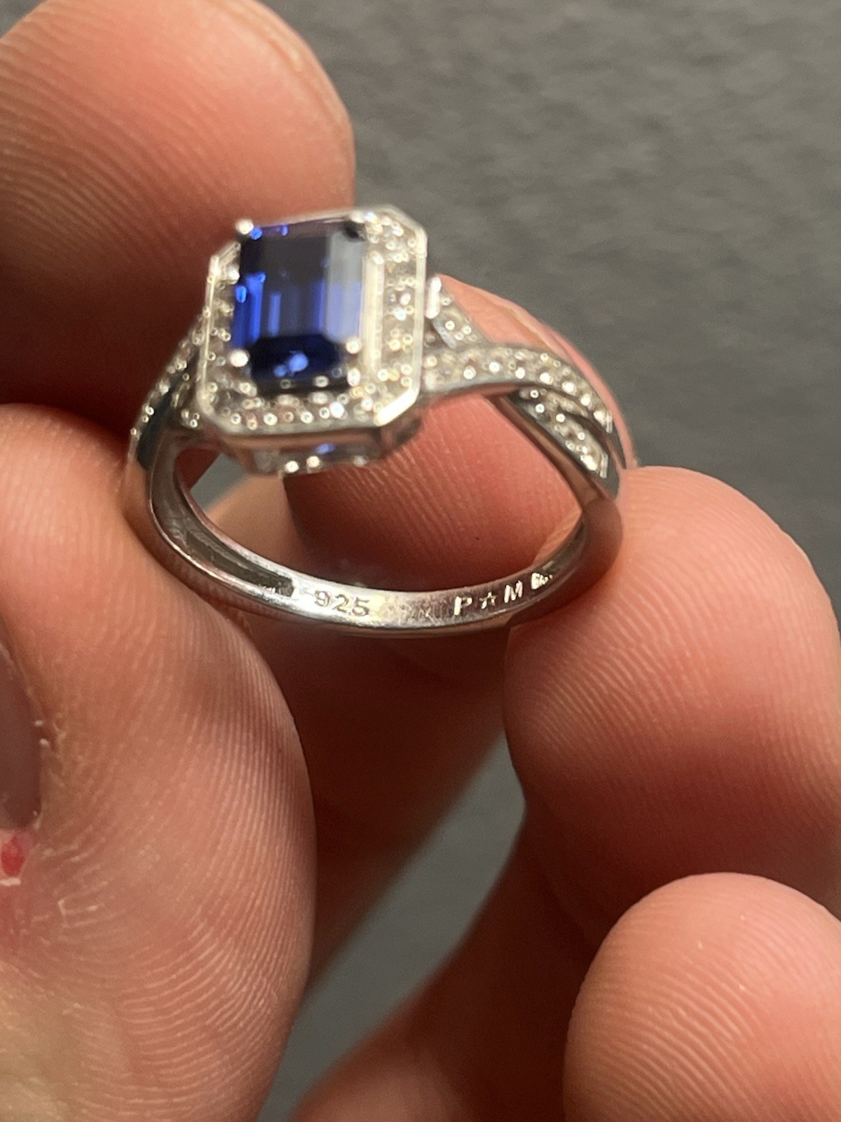 Sterling Silver 925 Large Rectangle Blue Sapphire White Sapphires Size 6.75