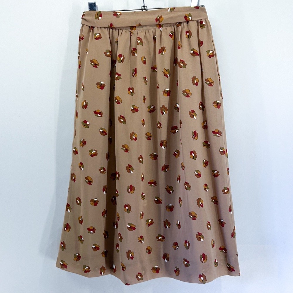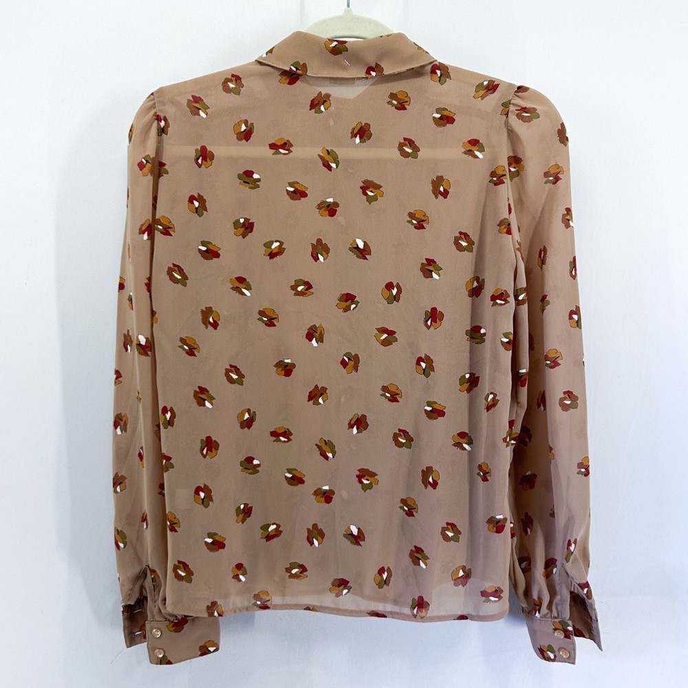 как выглядит Vintage 80s Two Piece Set Sheer Cropped Blouse Midi Skirt Tan Fall Leaves Print фото