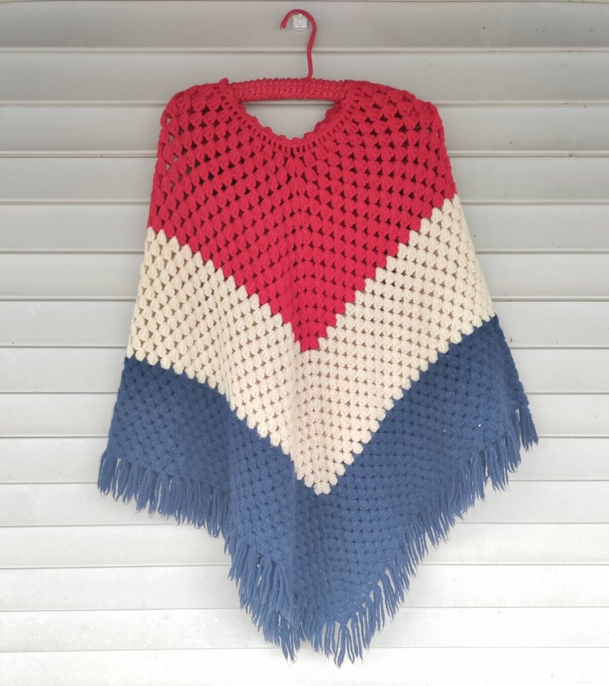Vintage Hand-Crocheted Granny Stitch Poncho Fringe Red, White Blue One Size
