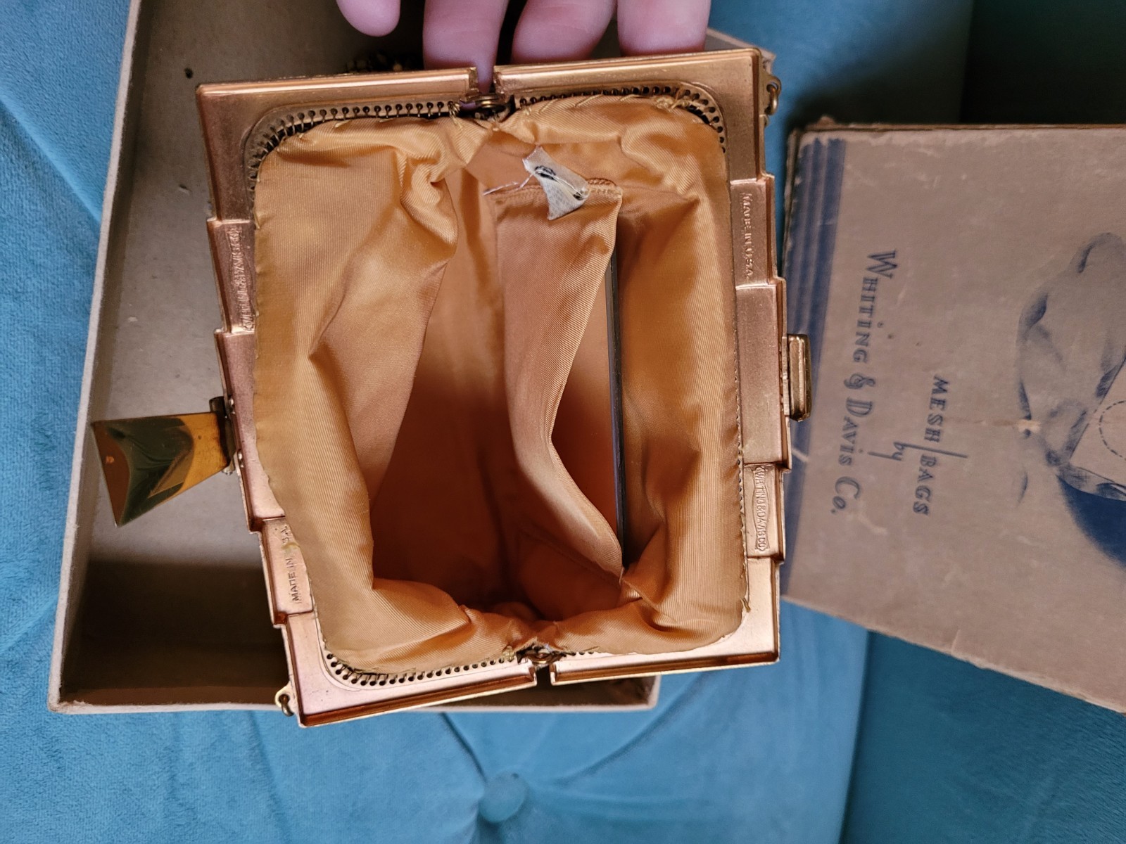 как выглядит Vintage Whiting and Davis Art Deco Gold Metal Mesh Bag Purse USA In Box фото