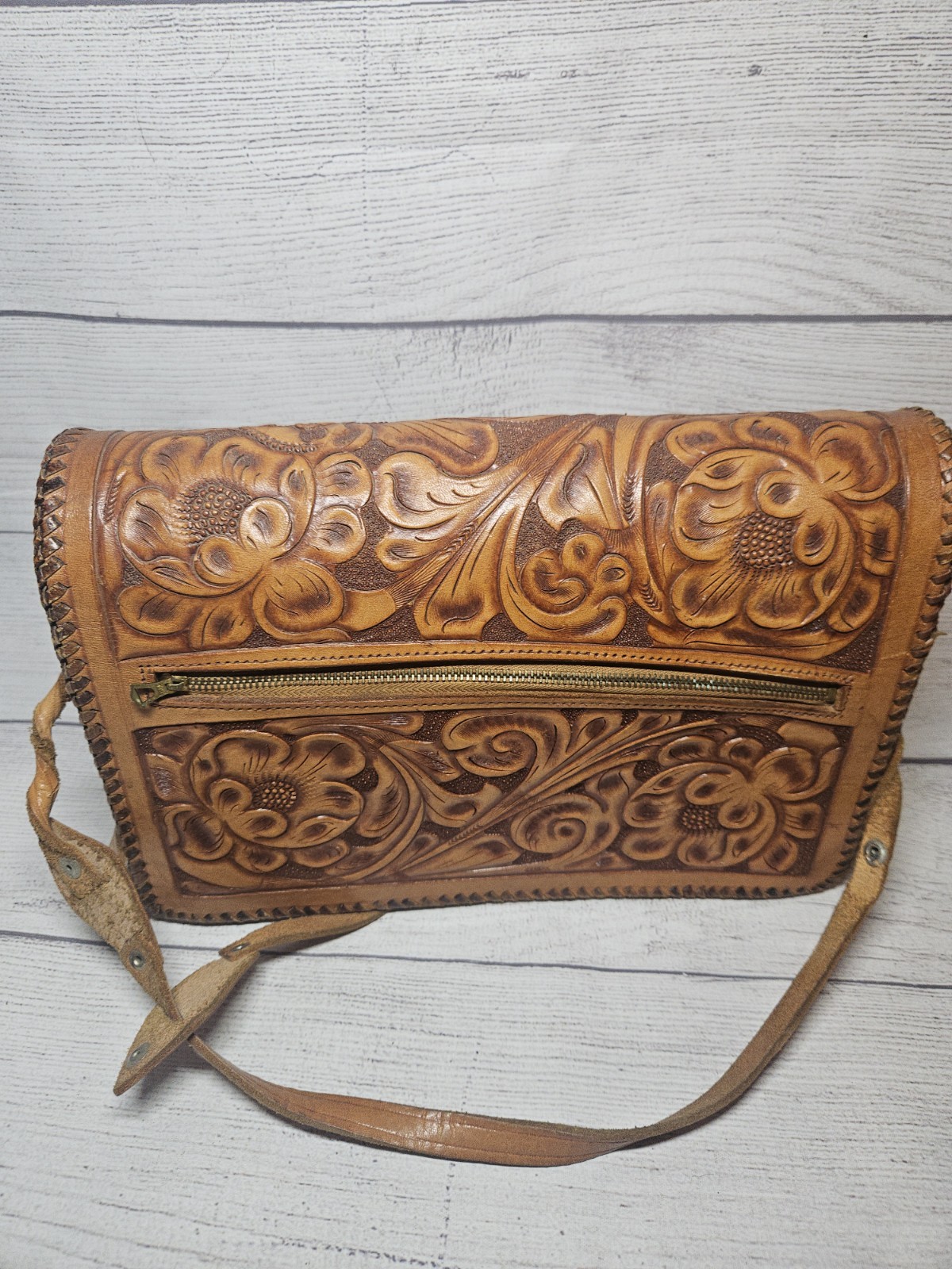 Vintage Hand Tooled Leather Purse Handbag - 11.5 - Floral, Country Design