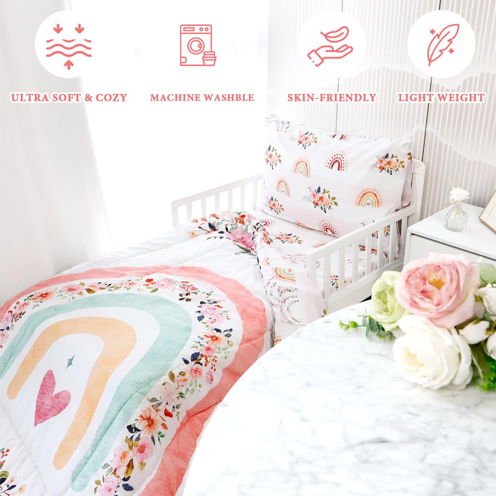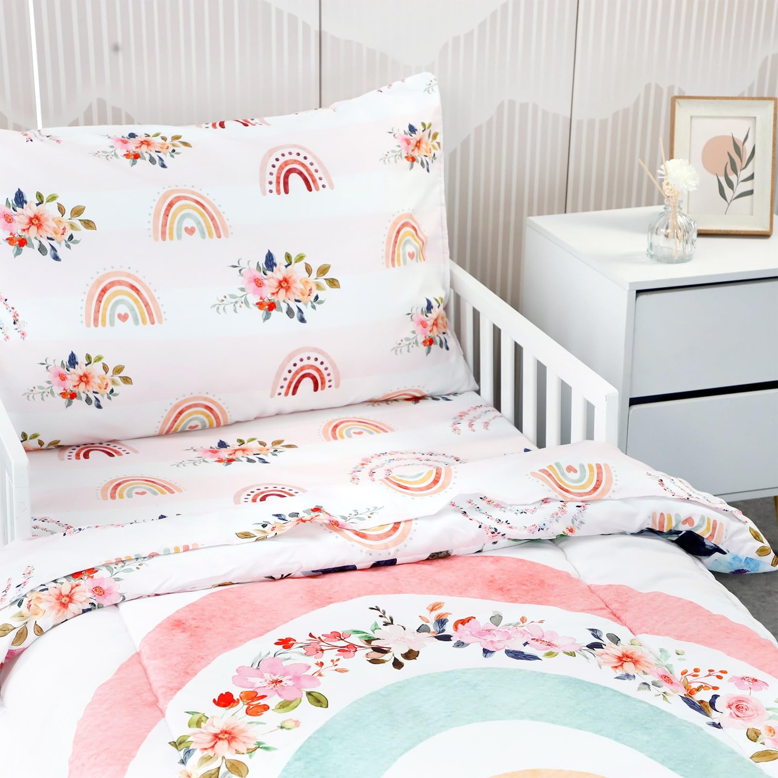 Toddler Bedding Sets for Girls, Rainbow Toddler Crib Bedding Set 4 Piece Pink...