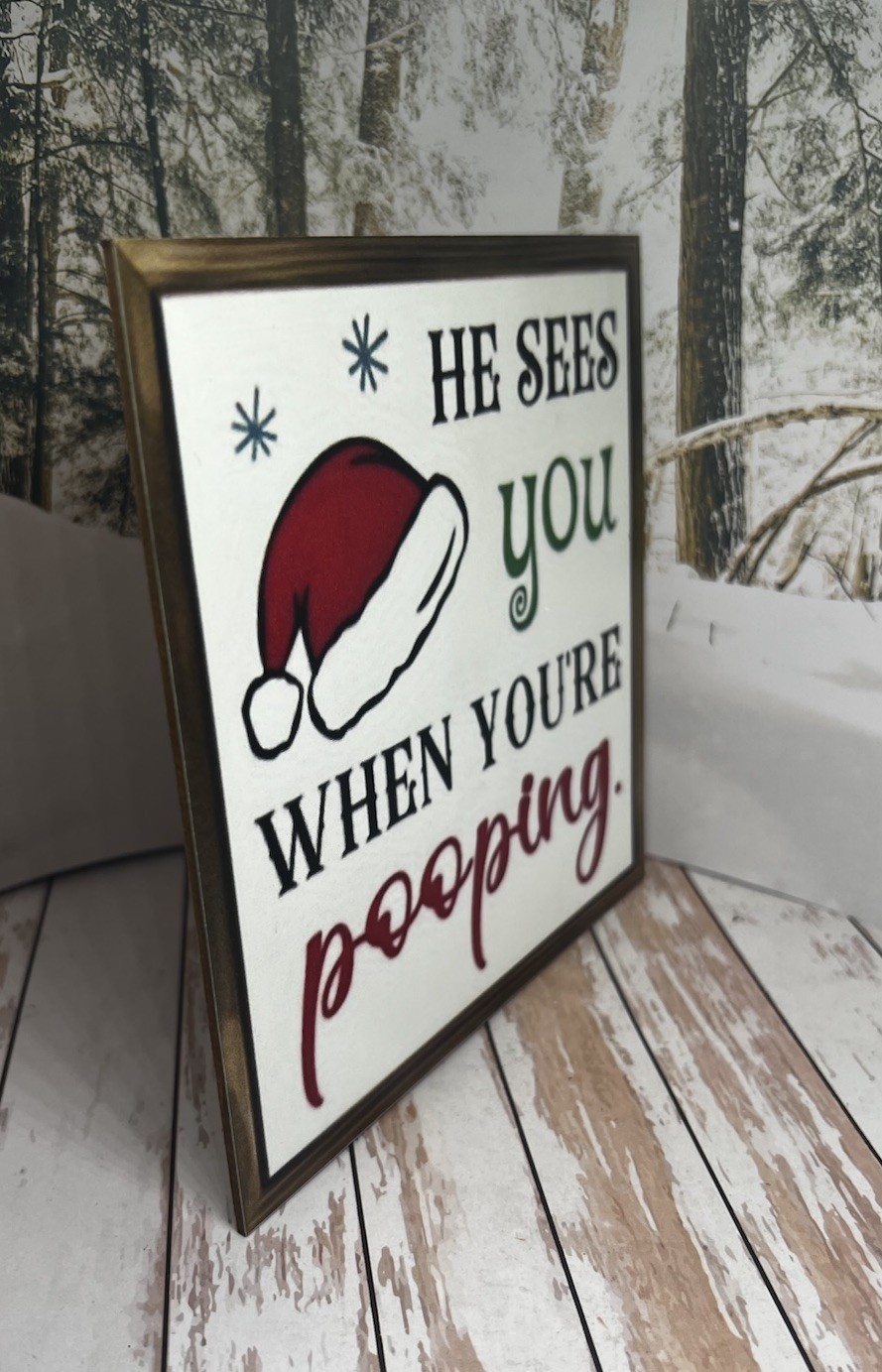 Christmas Bathroom Sign He Sees you When You're Pooping Wood Funny Santa New 6
