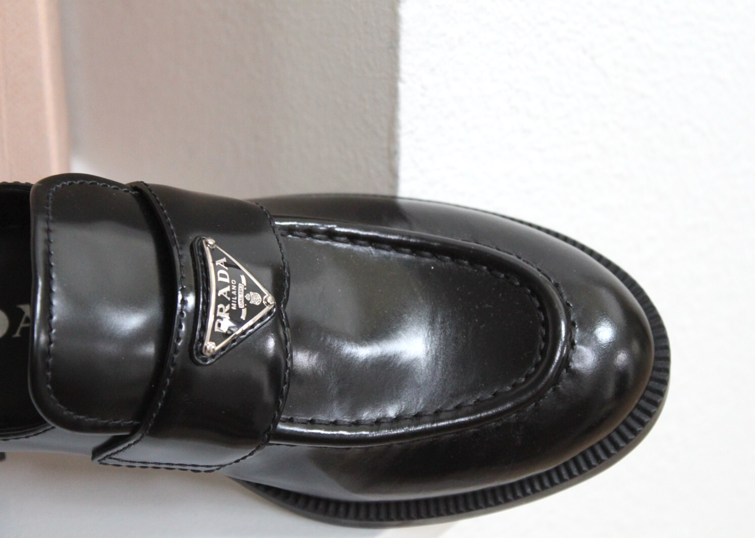 как выглядит sz 6.5 / 37 PRADA Triangle Logo Black Leather Loafer Slip on Flat Women Shoes фото