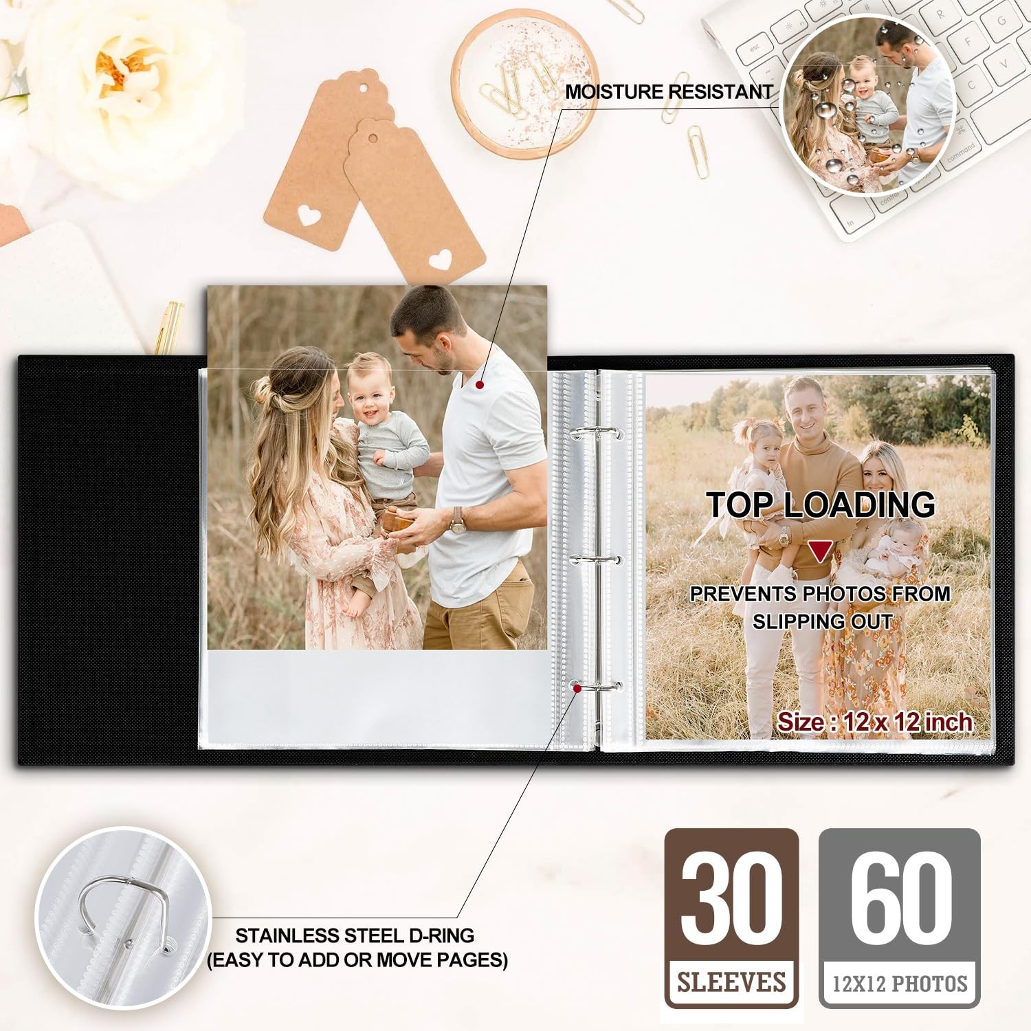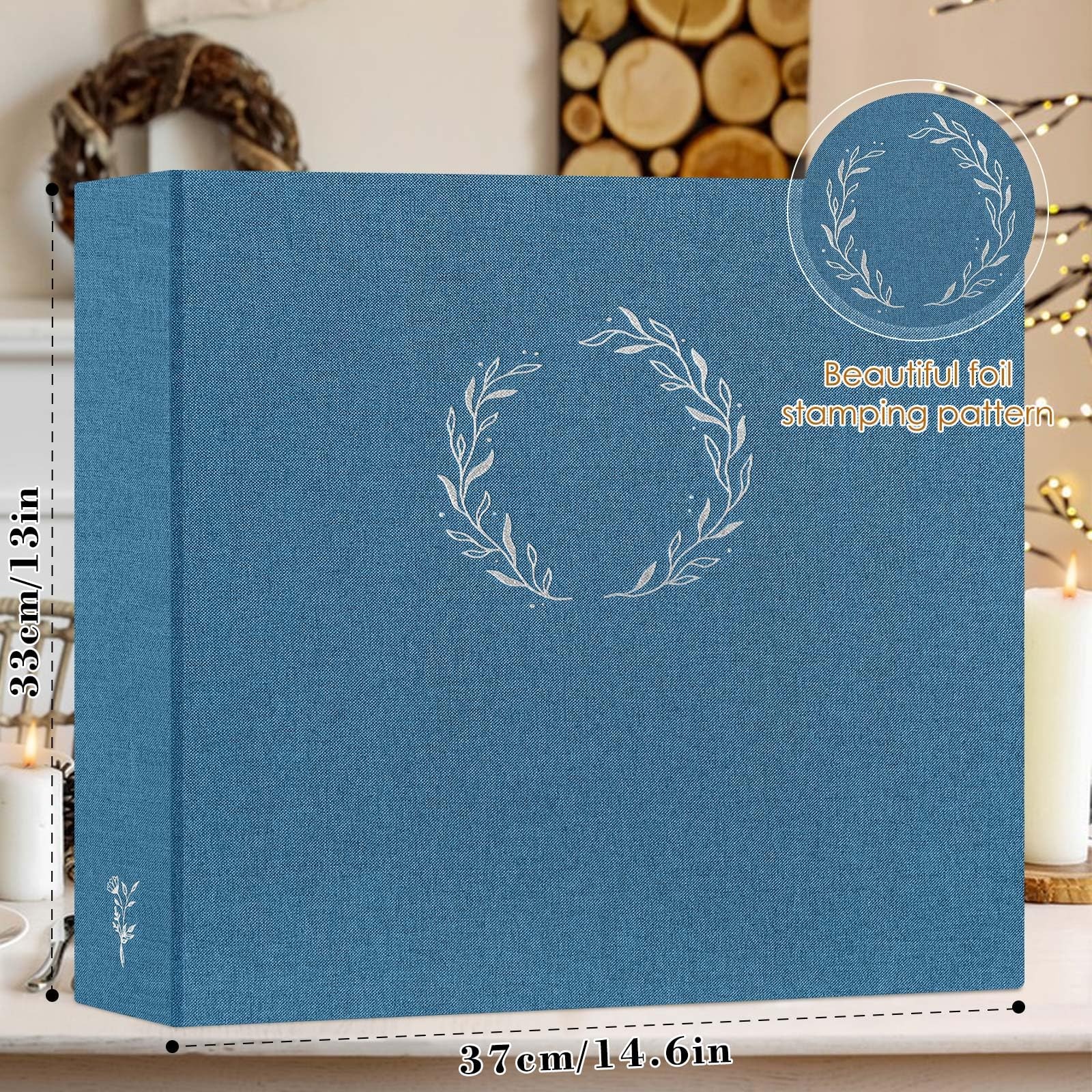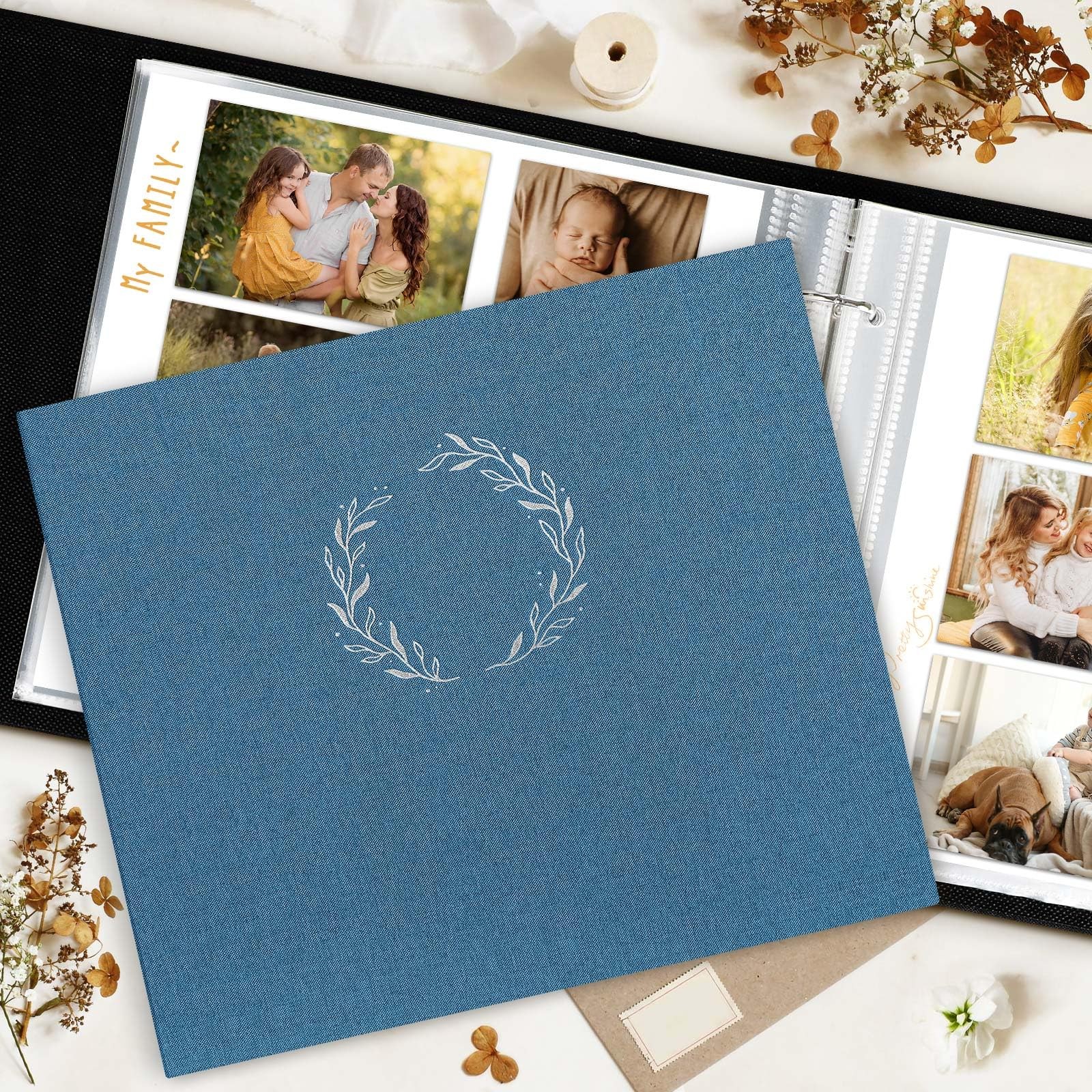 Lanpn 12x12 Photo Album Scrapbook - Linen Cover Wreath Design, 3-Ring, 60 Pages