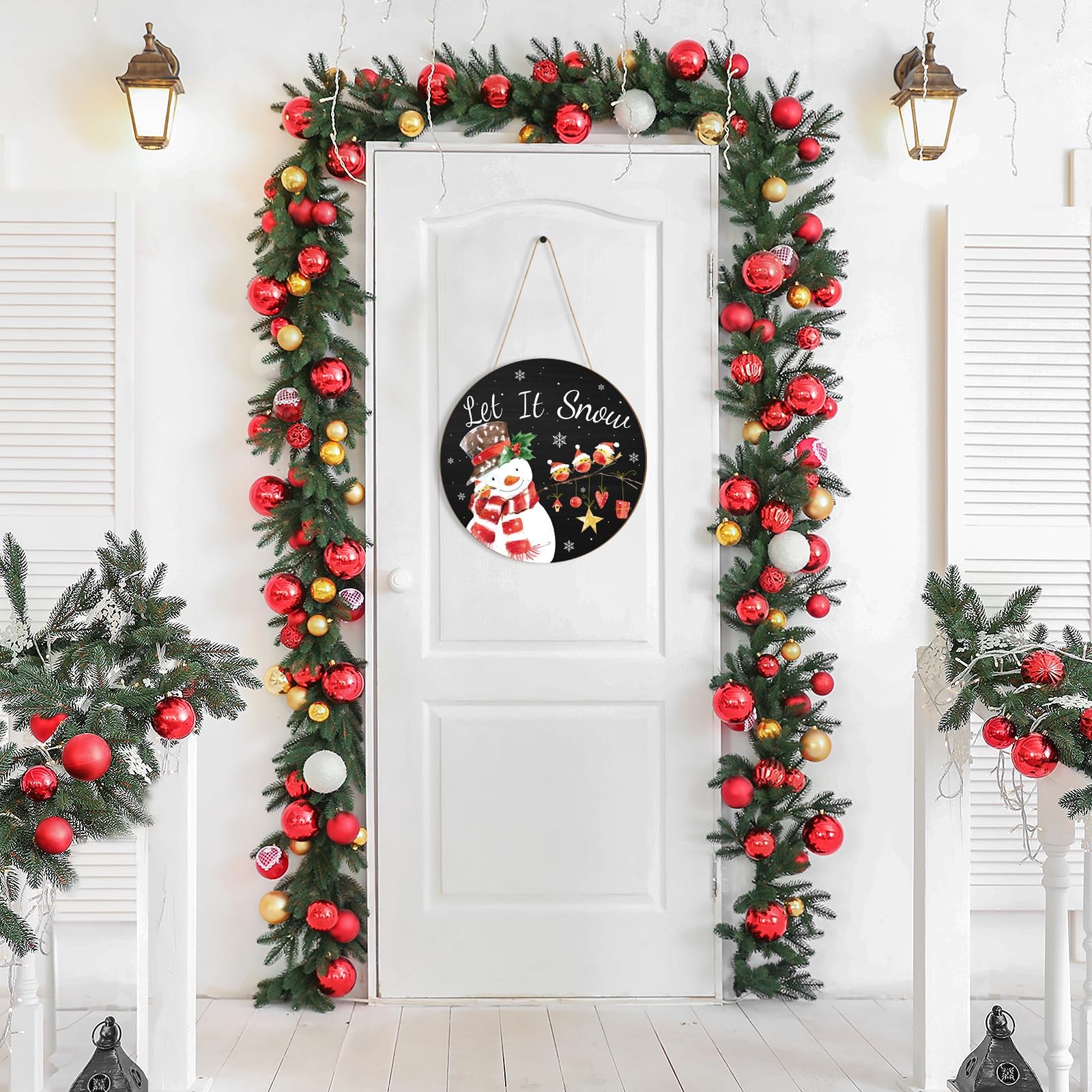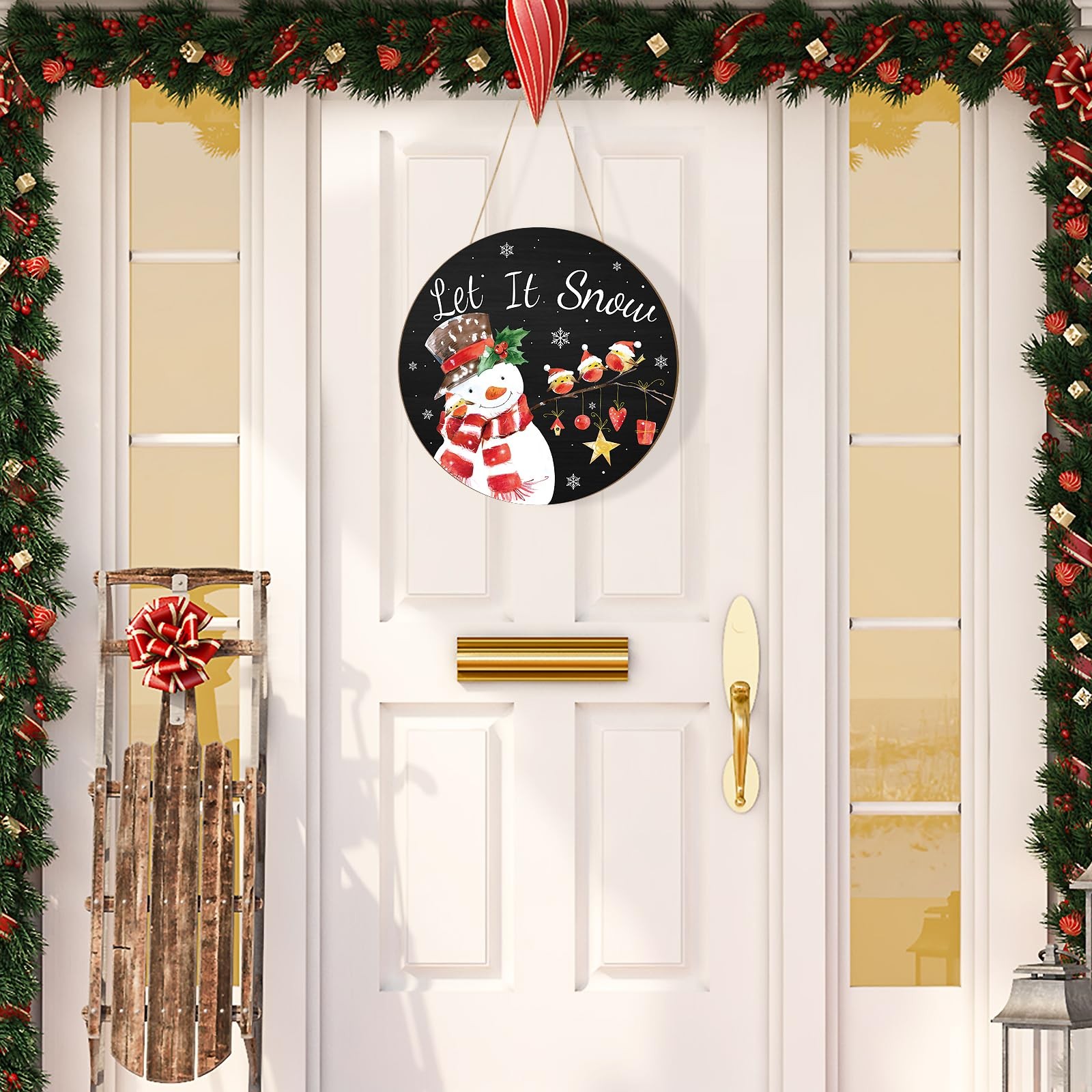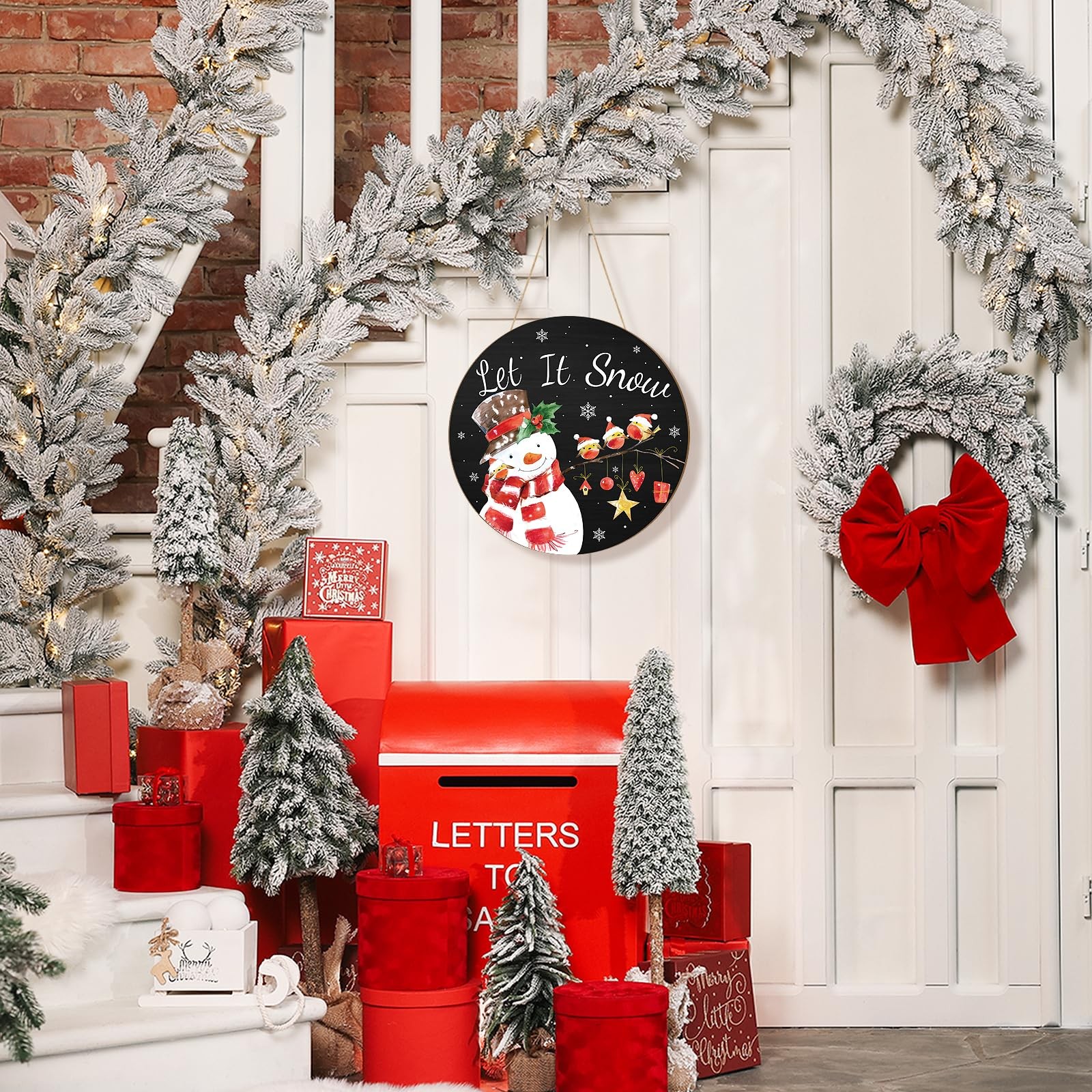 • Wooden Christmas Door Wreath for Front Sign Snowman Wall Large, Red