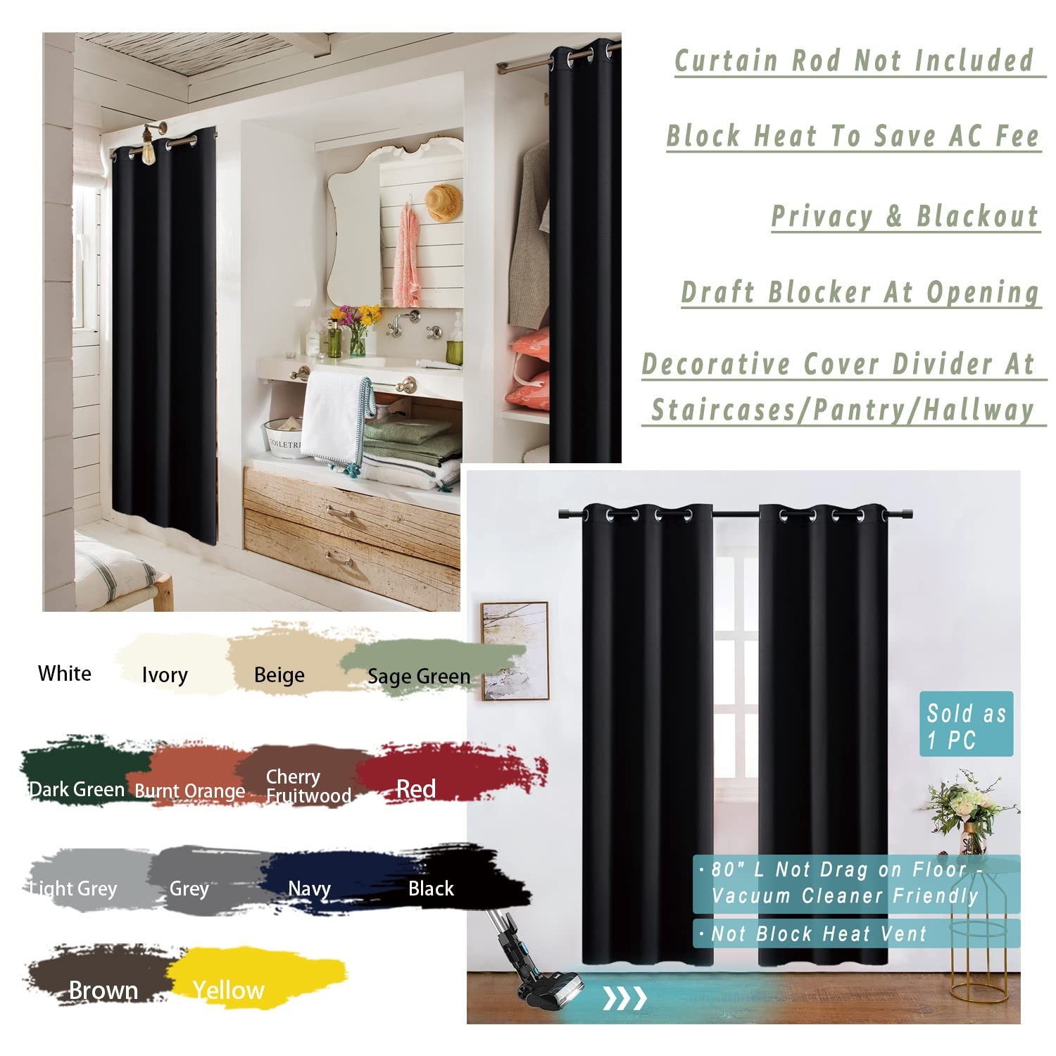 Door Curtain for Doorway Privacy,Closet 34W x 80L Pack of 1 , Black