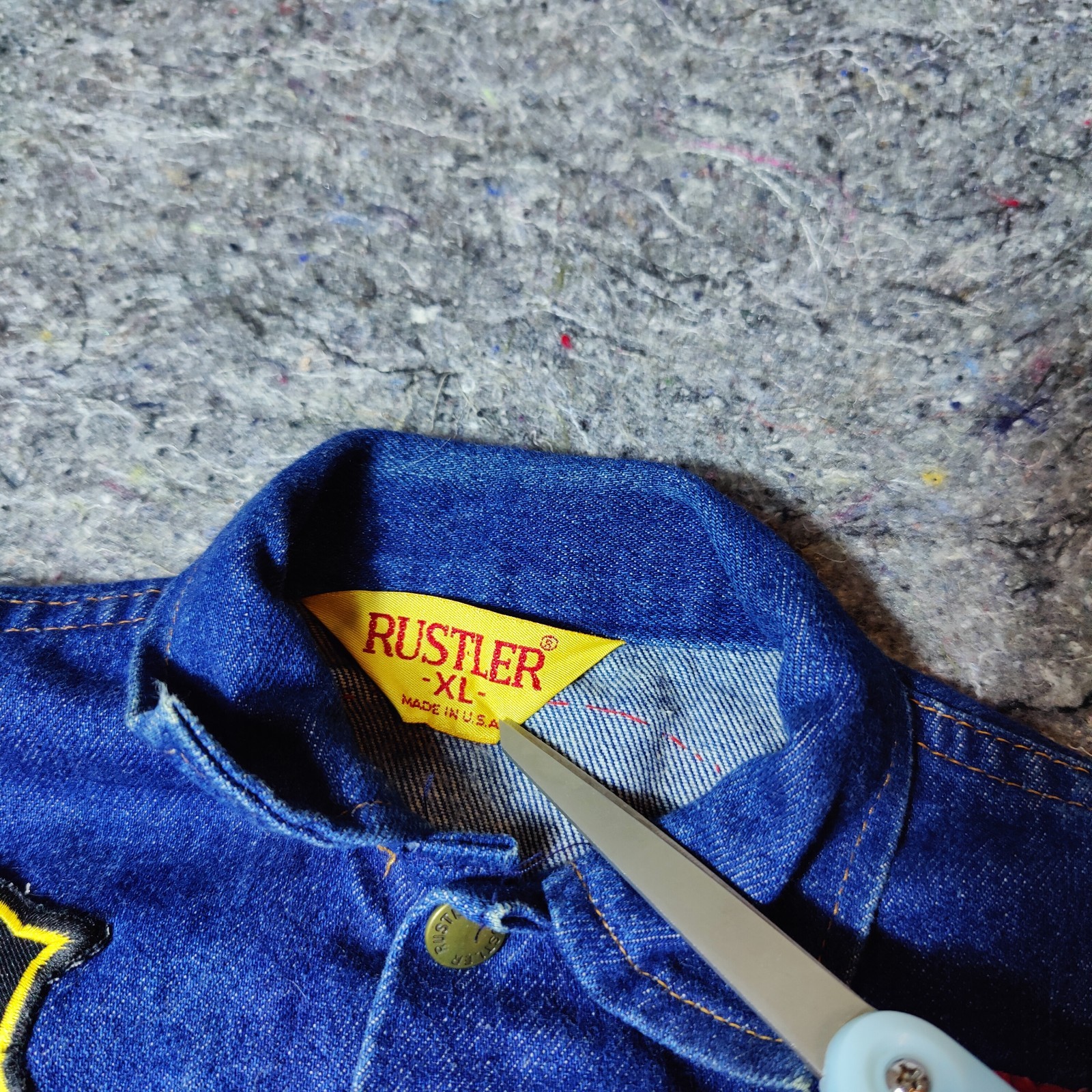 как выглядит Vintage Rustler Trucker Denim Jacket Youth XL Blue Denim Medium With Patches фото