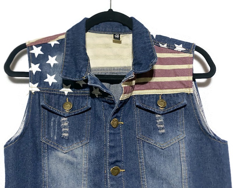 Tang Ku Distressed American Flag Vest Youth Size Large Blue Denim Button Up