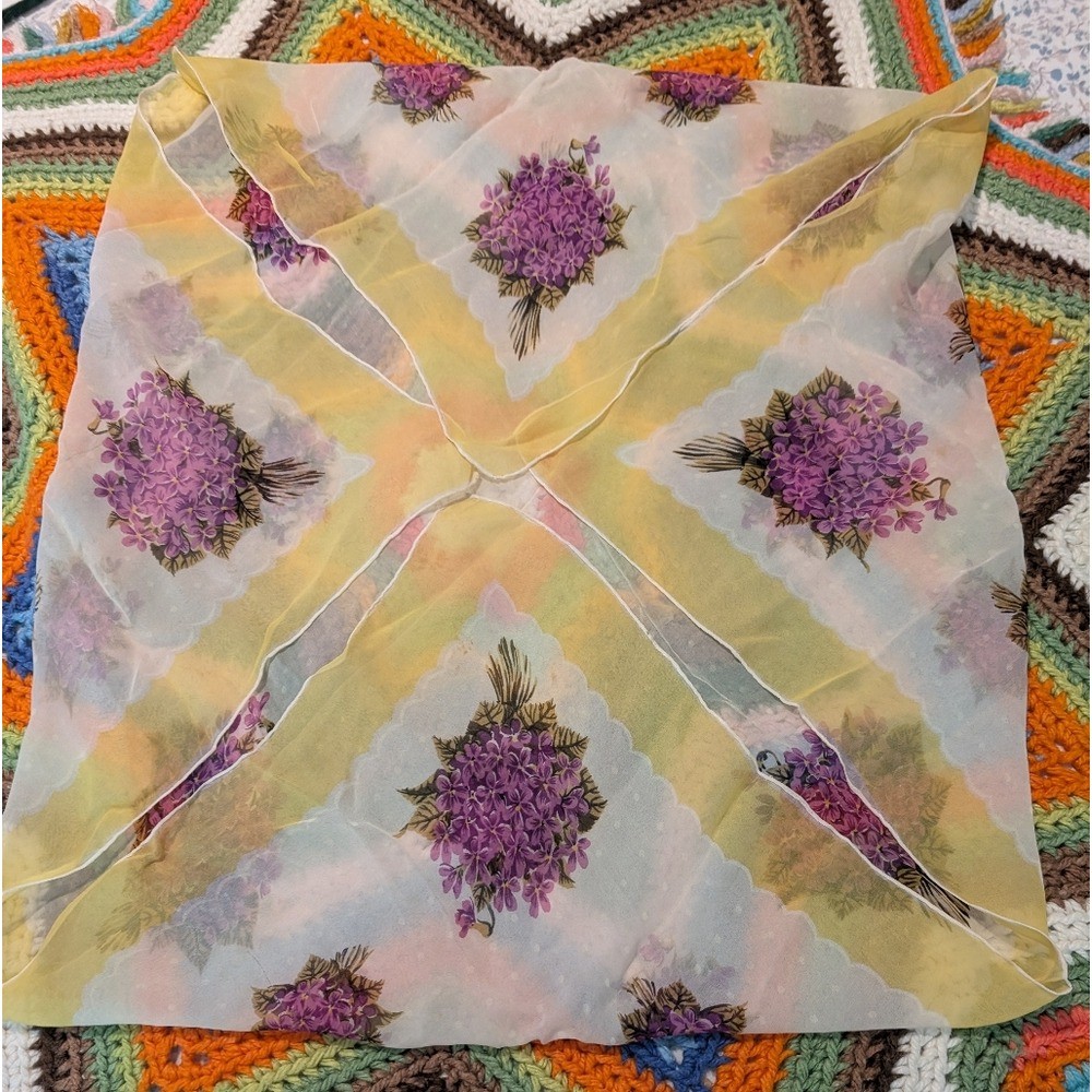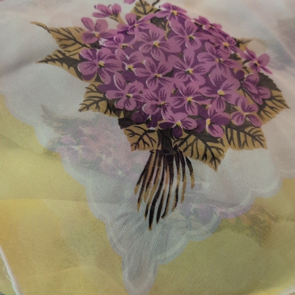 как выглядит 50s 60s MCM Vintage Womens Silky Yellow Purple Floral Print Scarf фото