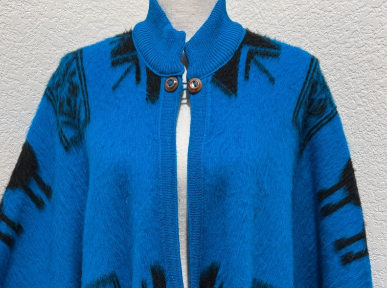 Tejidos Ruminahui Cape Poncho Wool Bright Blue LLama Print Relaxed L/XL Equador