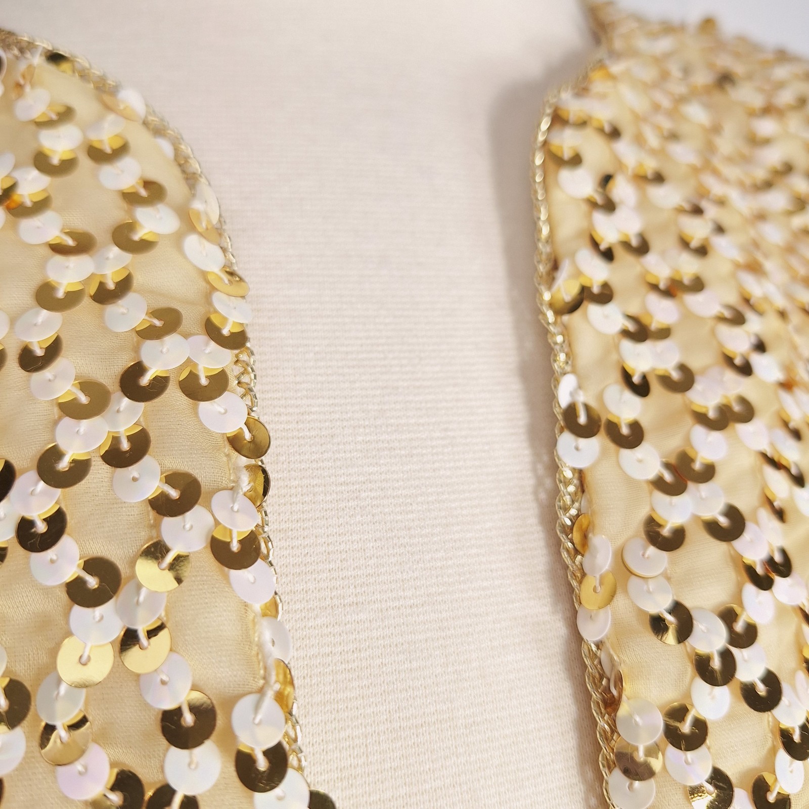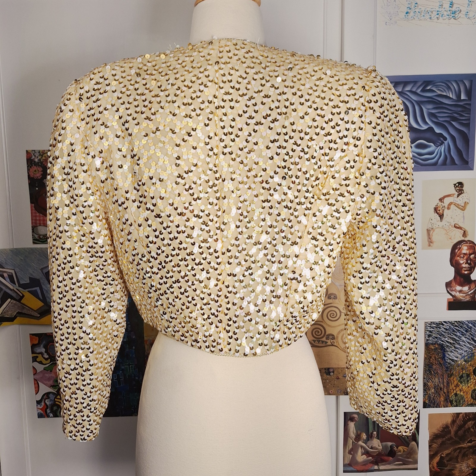 как выглядит Vintage 80s Gold Sequin Crop Bolero Jacket Sz Medium Giant Shoulder Pads Dynasty фото