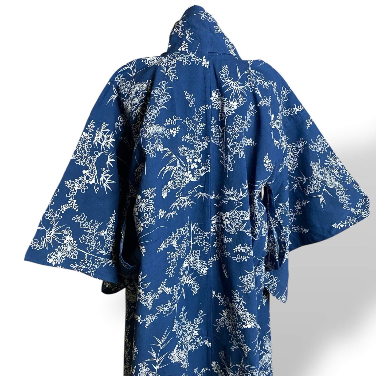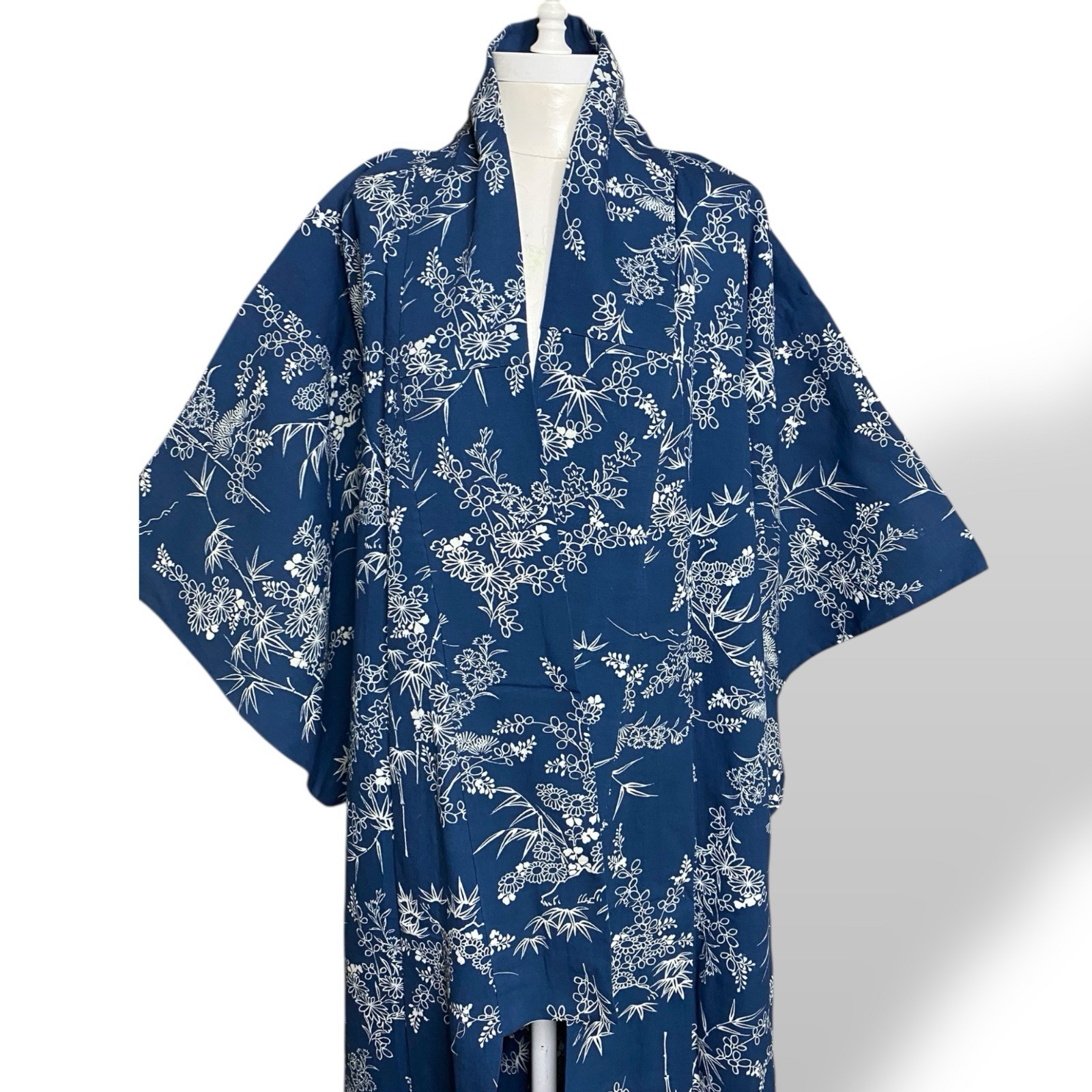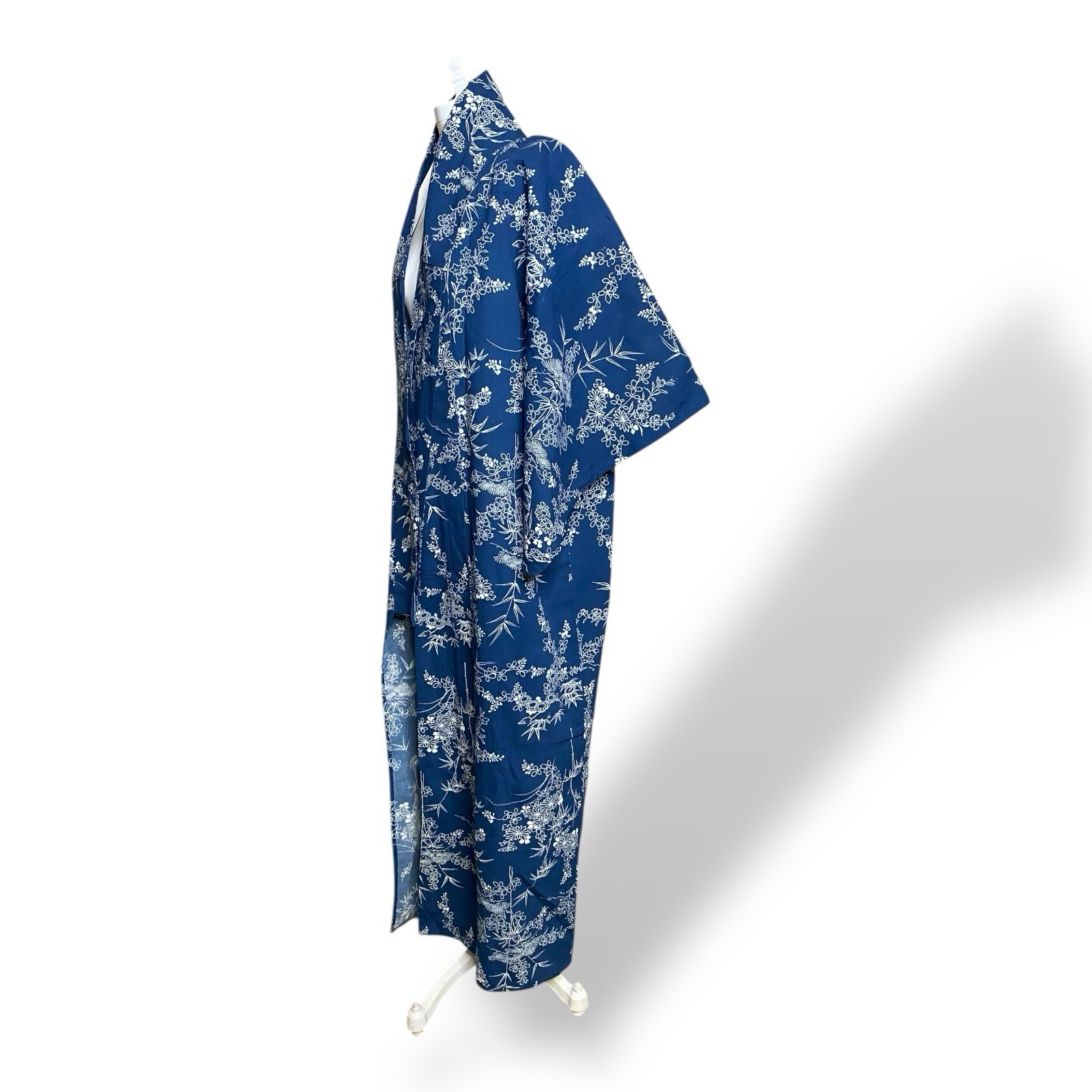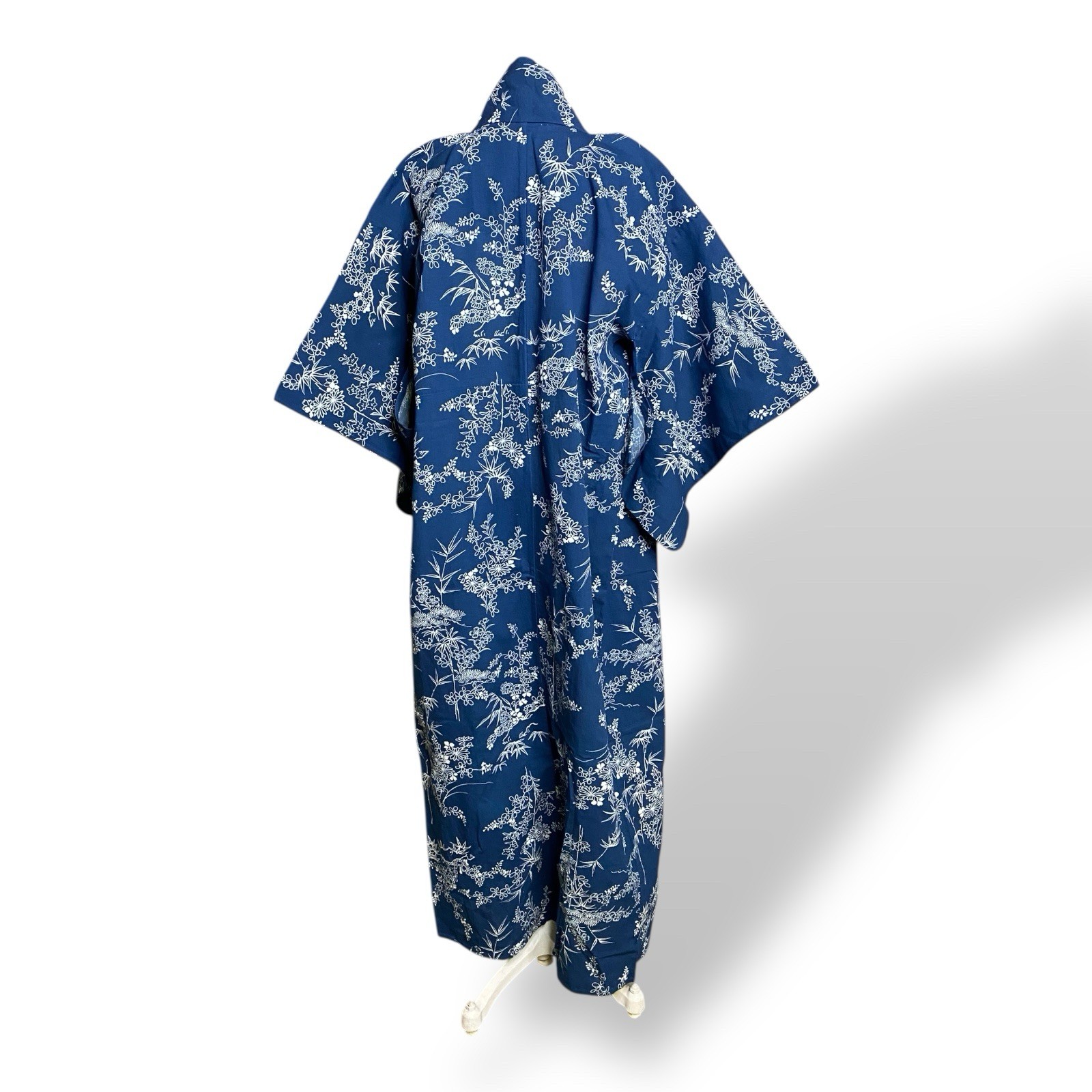 Vintage Kimono Robe Blue Floral One Size Full Length 1970s Unisex Bamboo Print