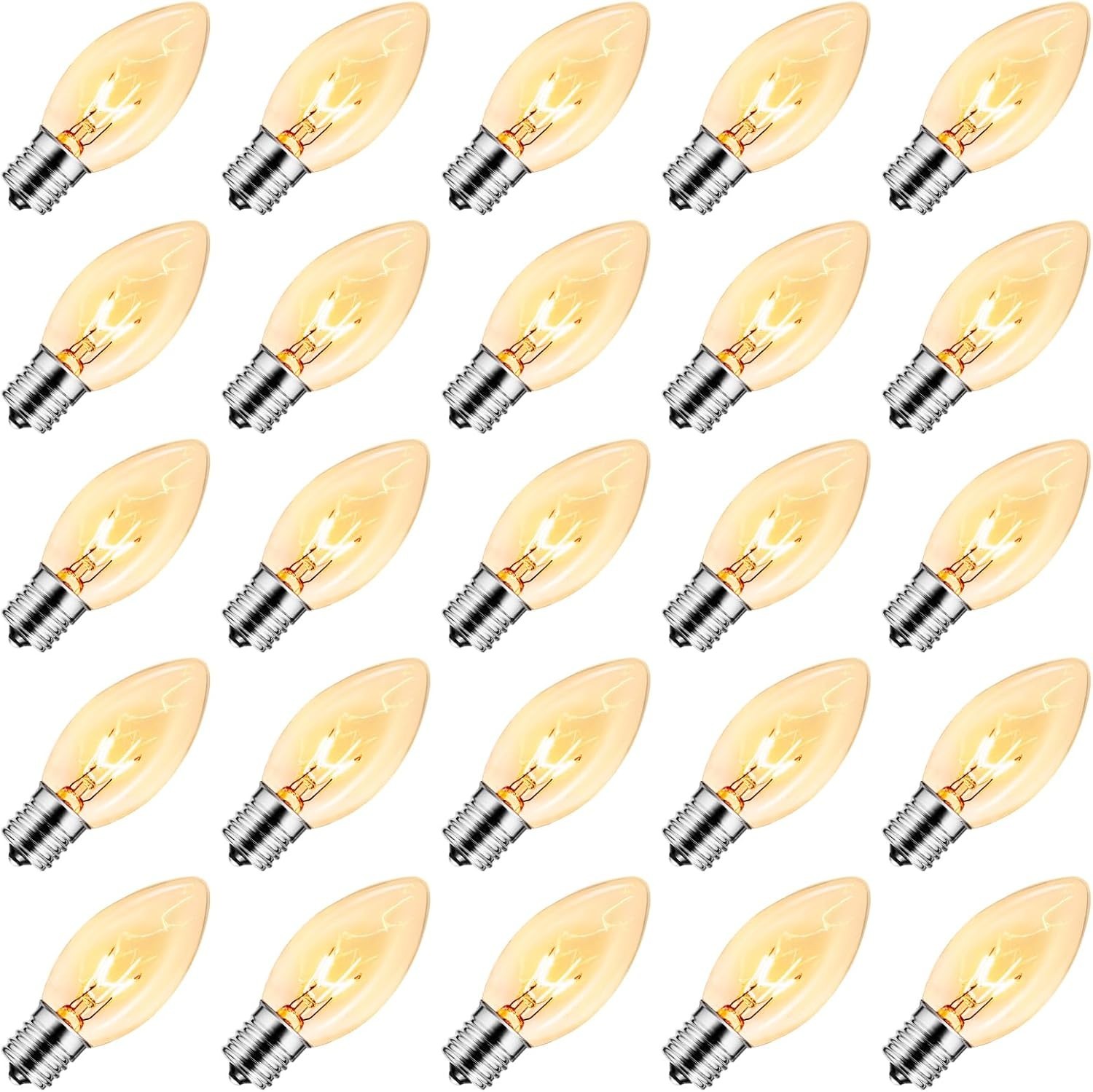 25 Pack C9 Clear Incandescent Light Bulbs 7 Watt E17 Base - Holiday Essential