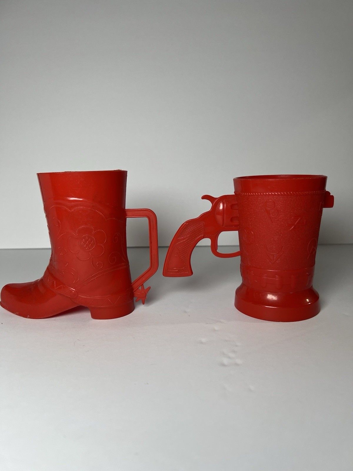 как выглядит Vintage Red Plastic Novelty Kids Mugs Cowboy Boot Pistol EZ-Por Chicago Set фото