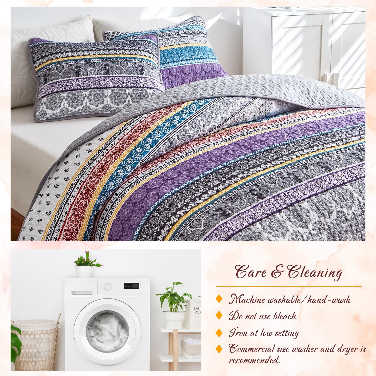 3 Pieces Colorful Bohemian Quilt Set Full Queen Size, Purple n Grey