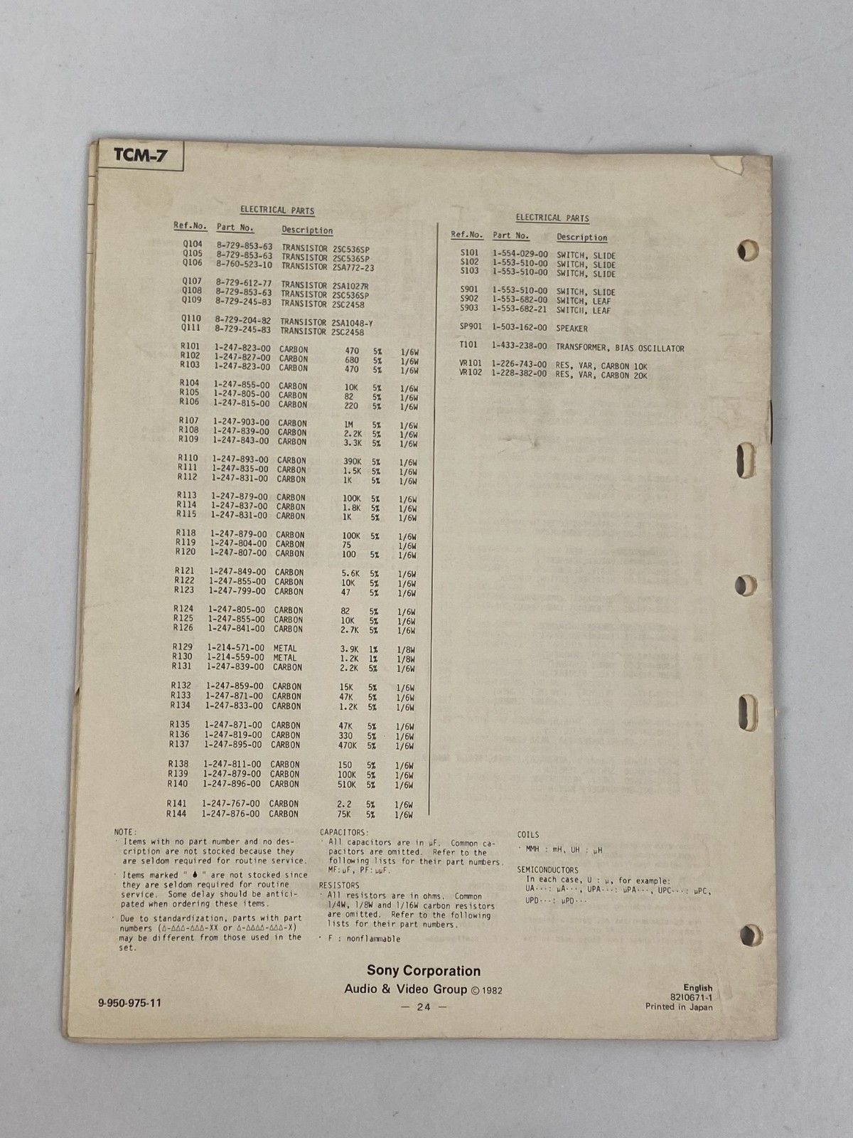 Vintage Sony TCM-7 Cassette Corder Service Manual Original