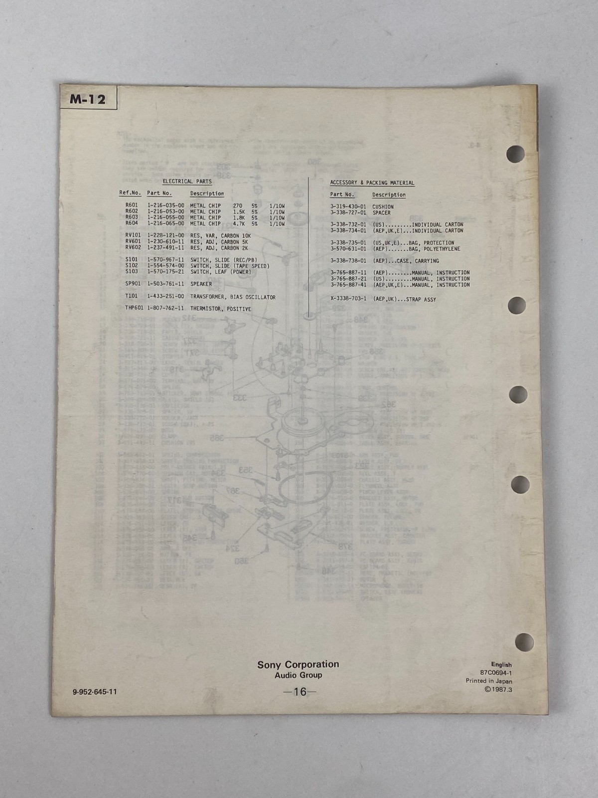 Vintage Sony M-7 / 12 Micro Cassette Service Manual Original