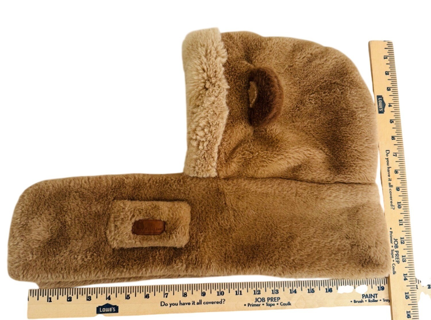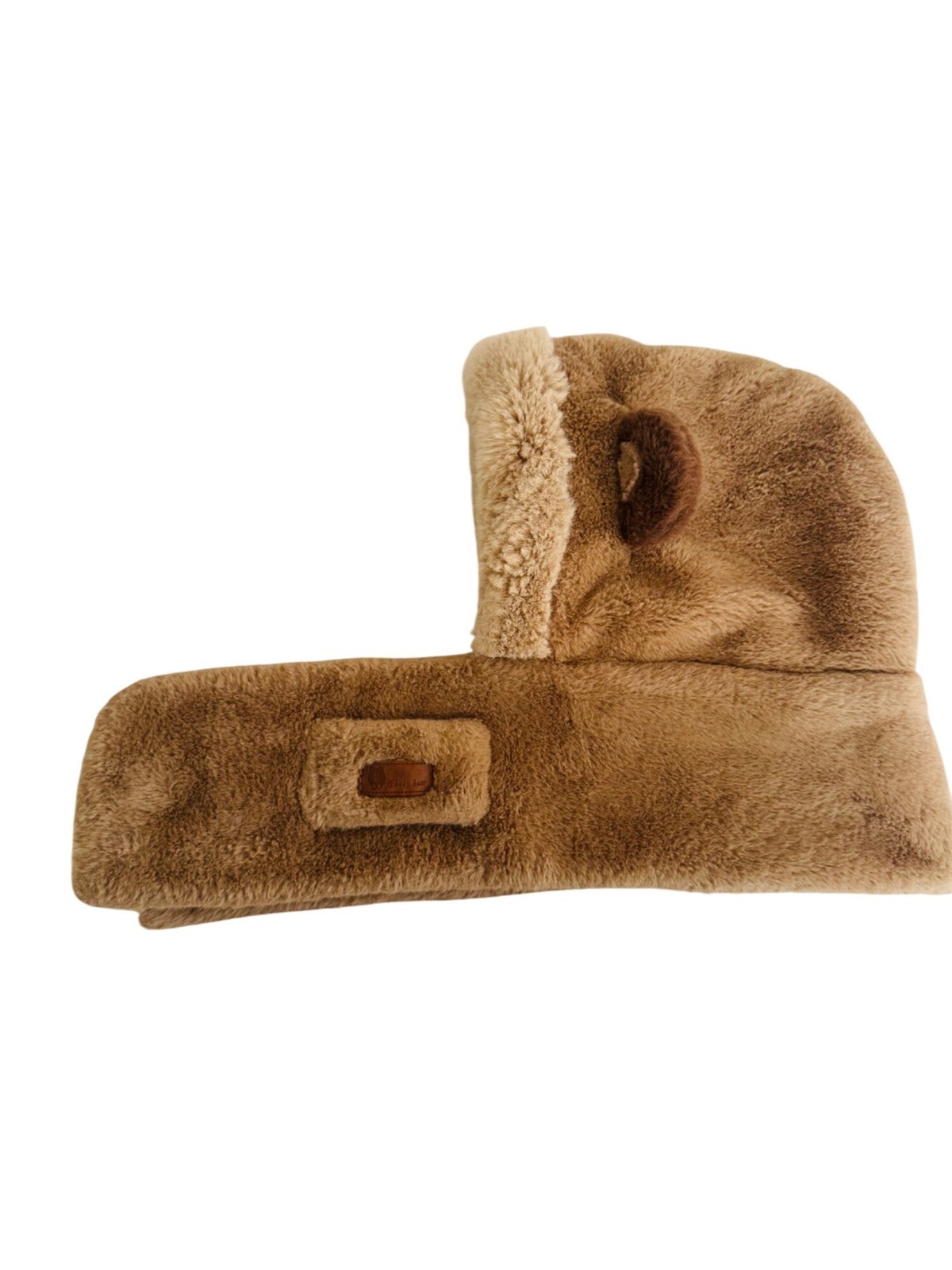 как выглядит Brown Faux Fur Baby Bear Hooded Scarf With Ear Details Leather Patch Accent фото