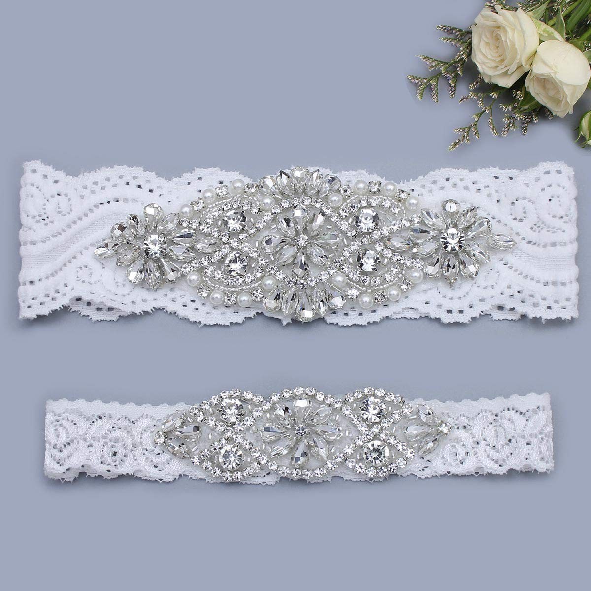 Wedding Garters Bride Non-Slip Silicone Lace Set Clear Rhinestones Pearl