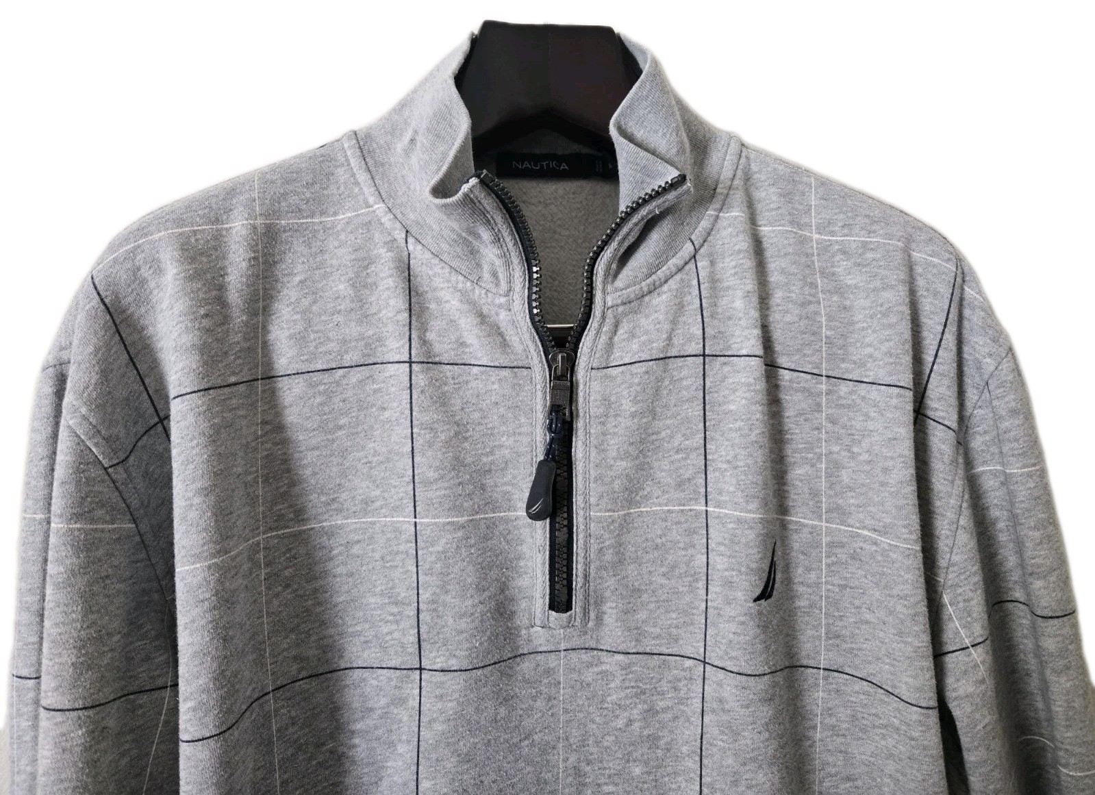 Nautica Mens Size XL Gray Windowpane Checks 1/4 Zip Pullover Mockneck