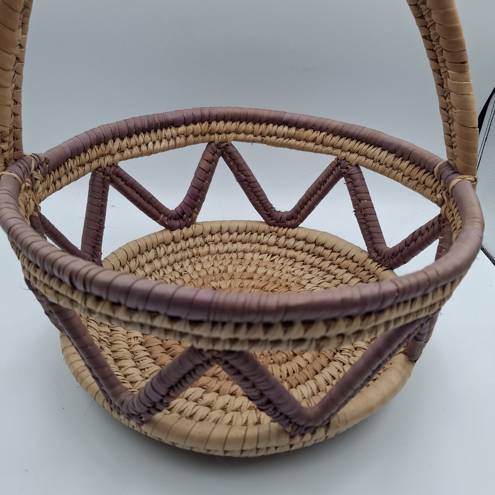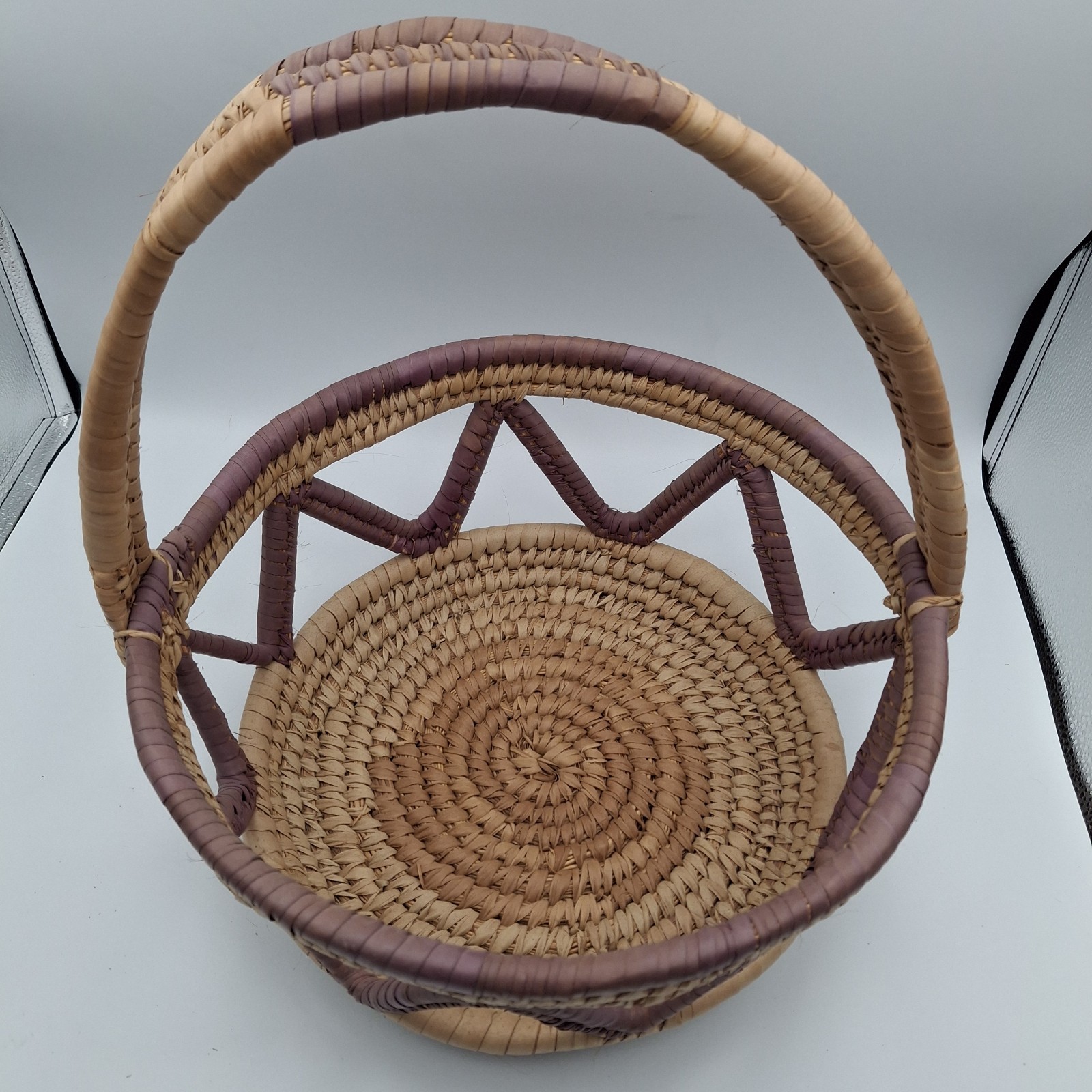 African Basket Coil Woven Open Weave Handle Hausa Style Afrohemian 13"x14" Vtg