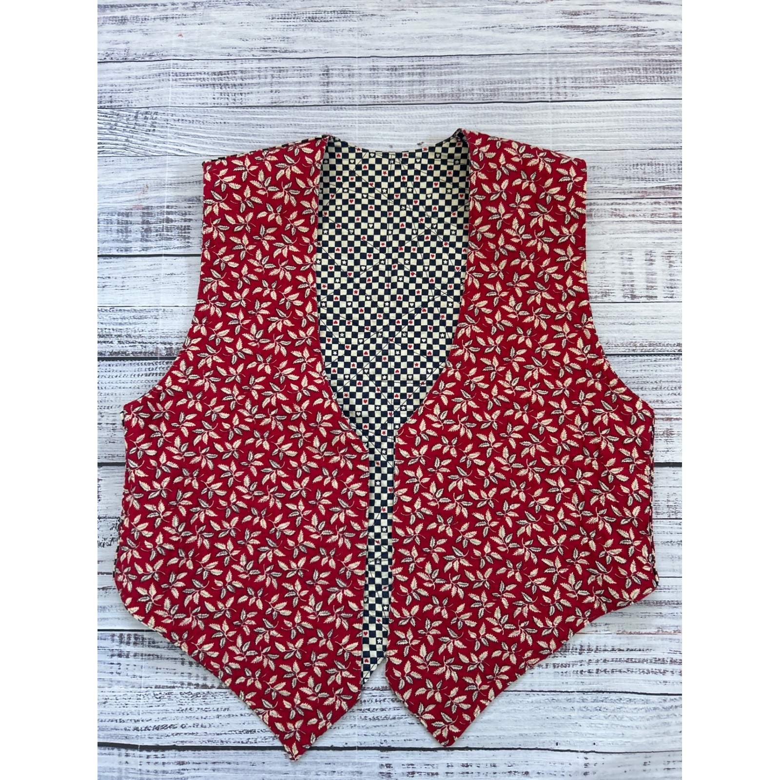 Reversible Quilted VTG Vest Country Check Red Floral Hearts Stars Cottage