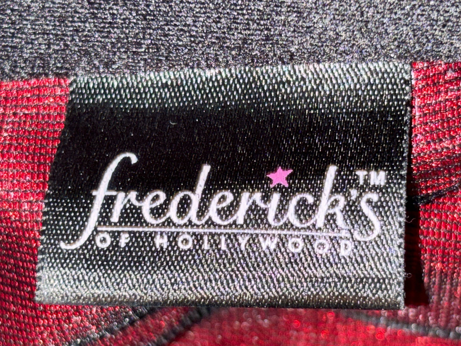 как выглядит VTG Fredericks Of Hollywood Corset Bustier Size M 36 B Red Satin Black Ruffle фото
