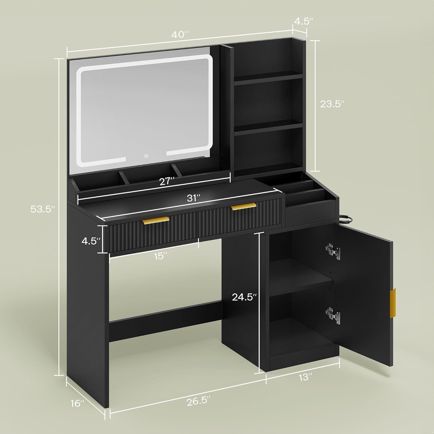 Fluted Vanity Desk with Mirror and Lights in 3 Modes and Charging Station