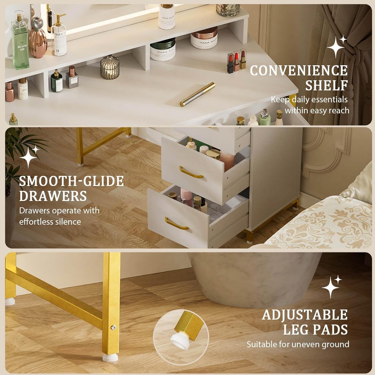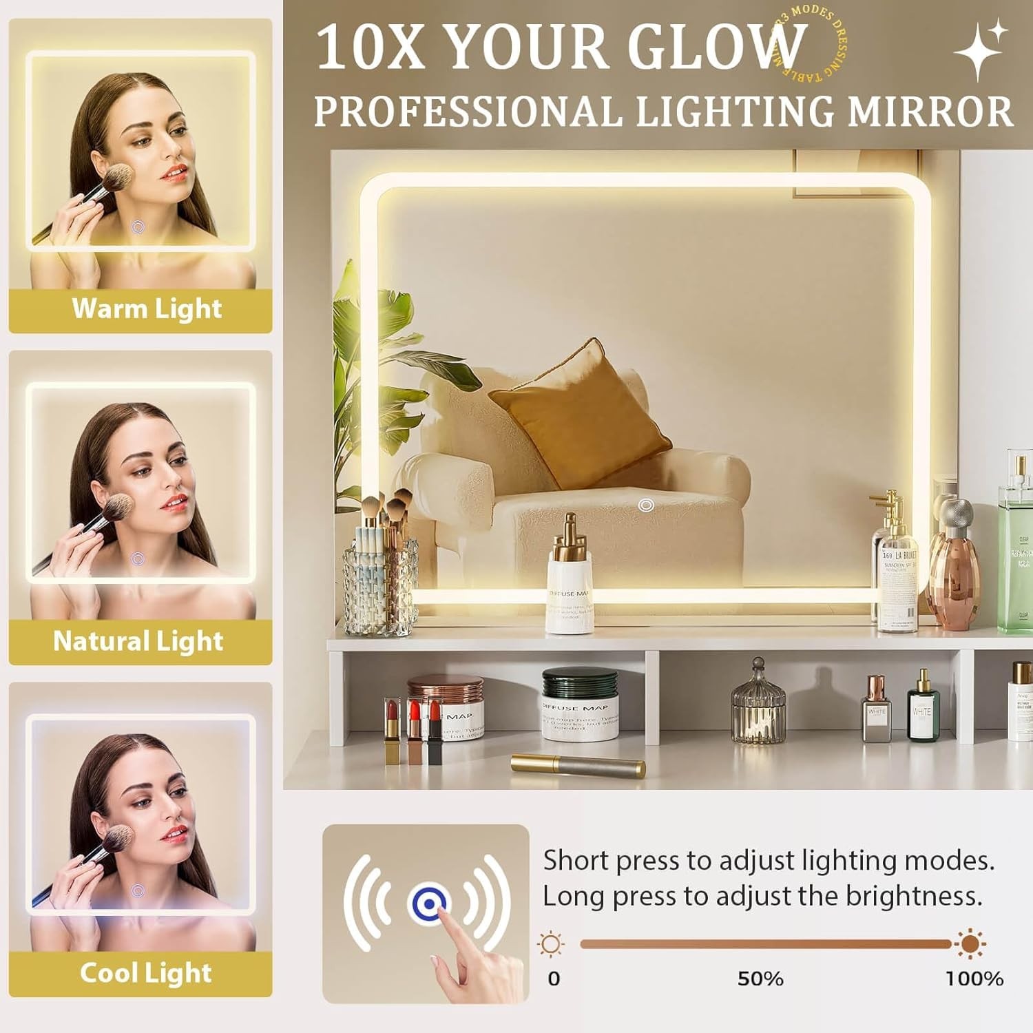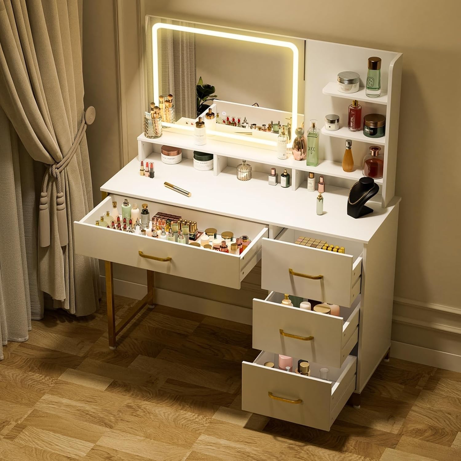 как выглядит Fluted Vanity Desk with Mirror and Lights in 3 Modes and Charging Station фото