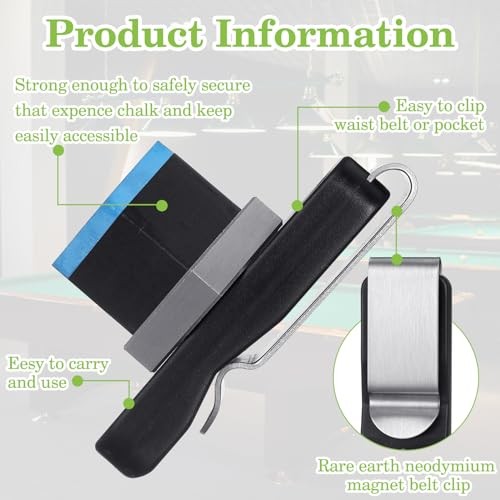 Included Components: 1 x Magnet belt clip for billiard, 4 x Metal chalk holders