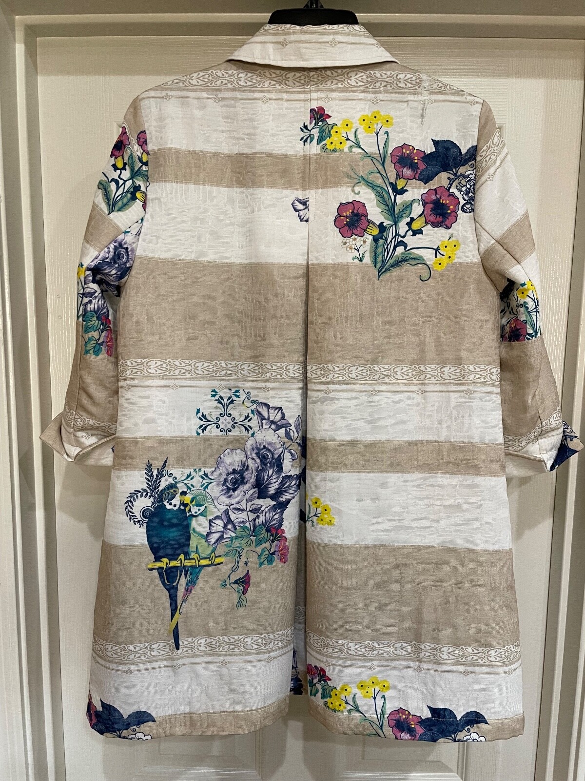 как выглядит CHICOS Jacket - White/Beige Polyester Buttoned, 3/4 Sleeve, Floral, Size 0, 4-6 фото