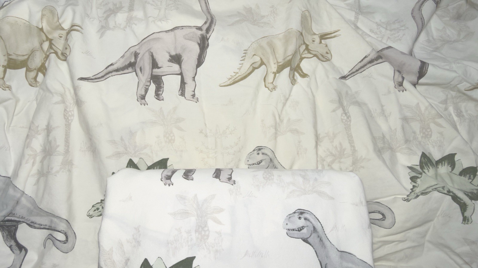 как выглядит POTTERY BARN Kids Dinosaur Twin Sheet Set Flat Fitted MUTED Dino Print фото