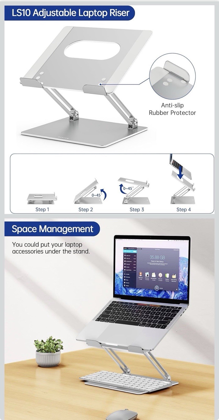Besign LS10 Adjustable Aluminum Laptop Stand Silver 10-14 Anti-Slip