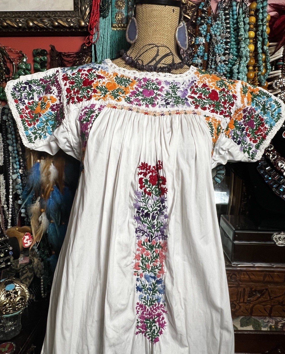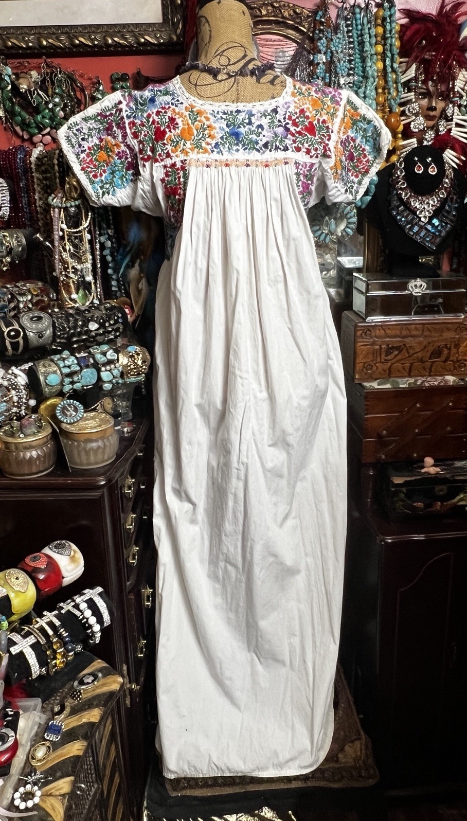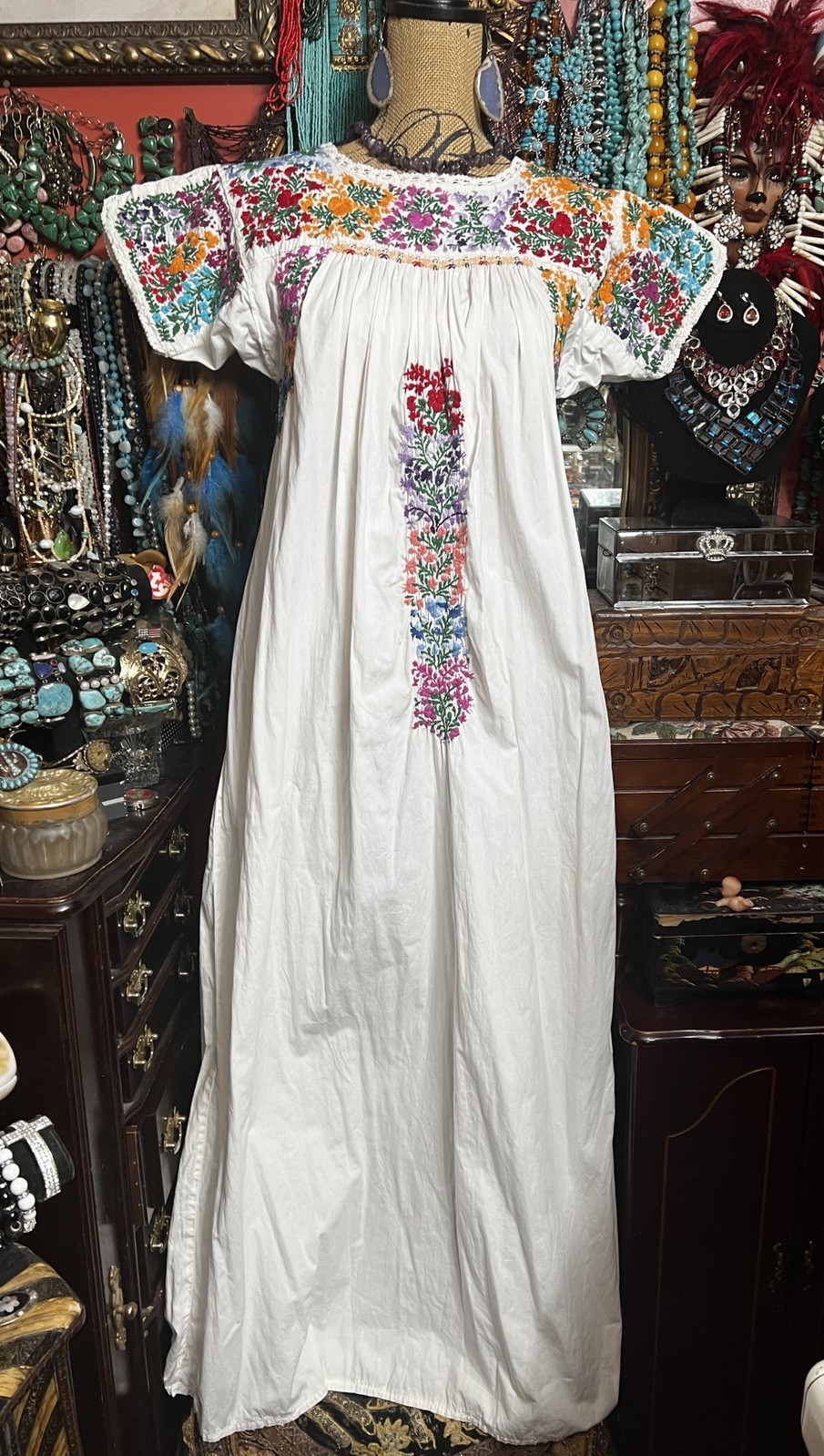 Beautiful 1970s Oaxacan White Dress Multi Color Embroidery White Crochet M/L
