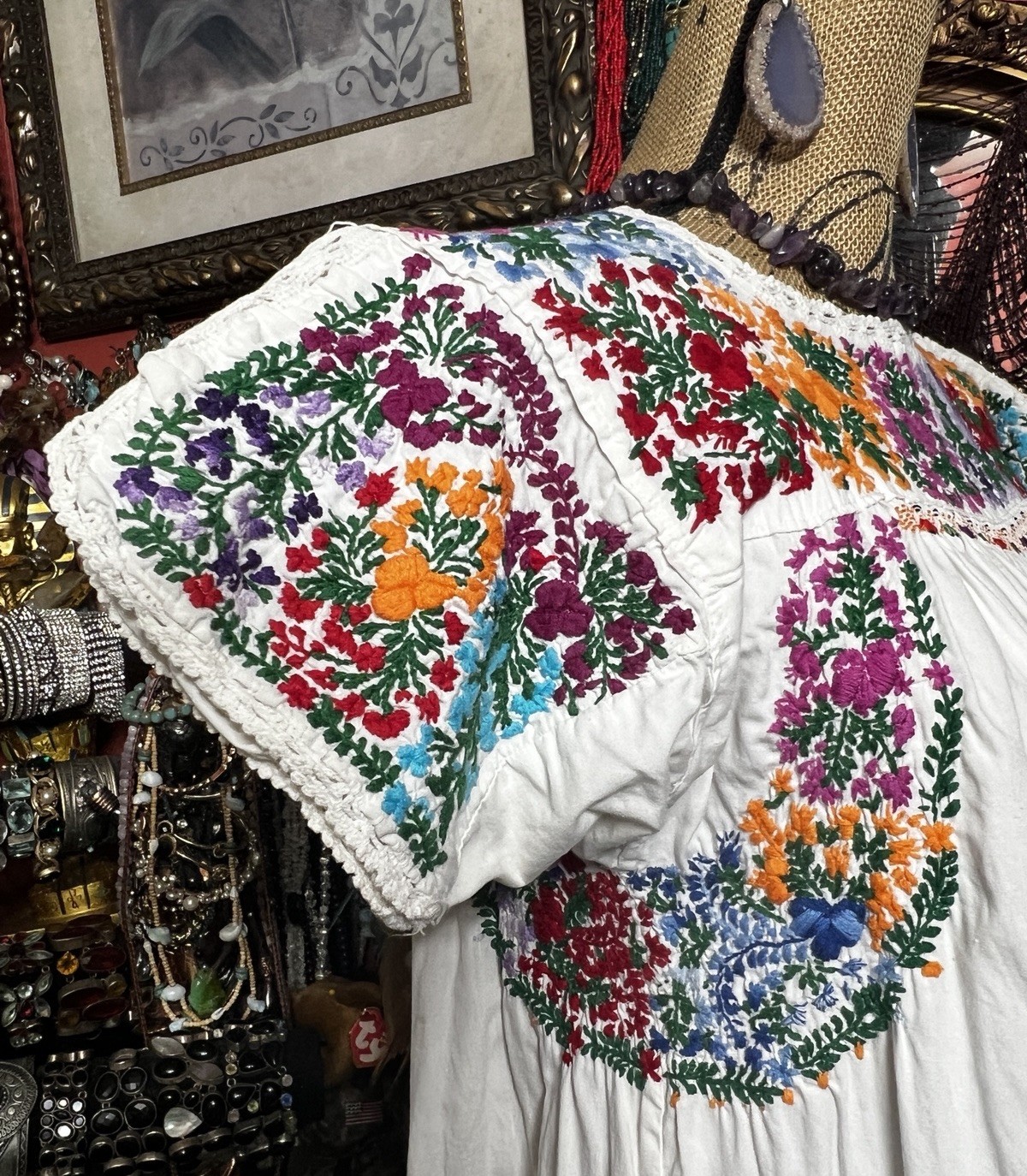 как выглядит Beautiful 1970s Oaxacan White Dress Multi Color Embroidery White Crochet M/L фото