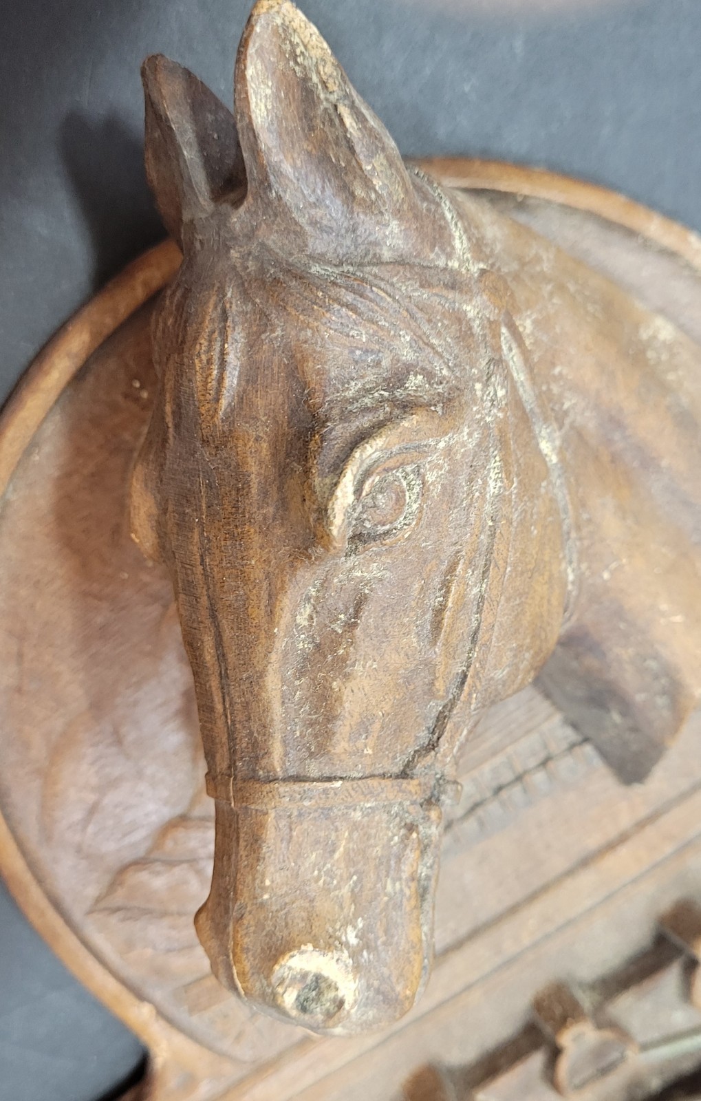 как выглядит Vintage Syroco Wooden Tie Belt Scarf Rack Horse Head with Country Scene фото
