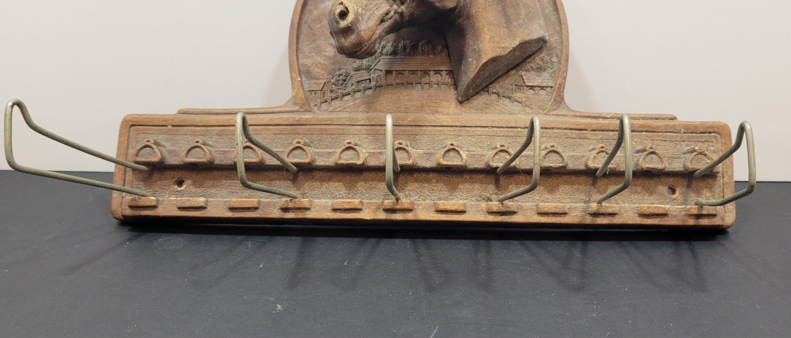 Vintage Syroco Wooden Tie Belt Scarf Rack Horse Head with Country Scene