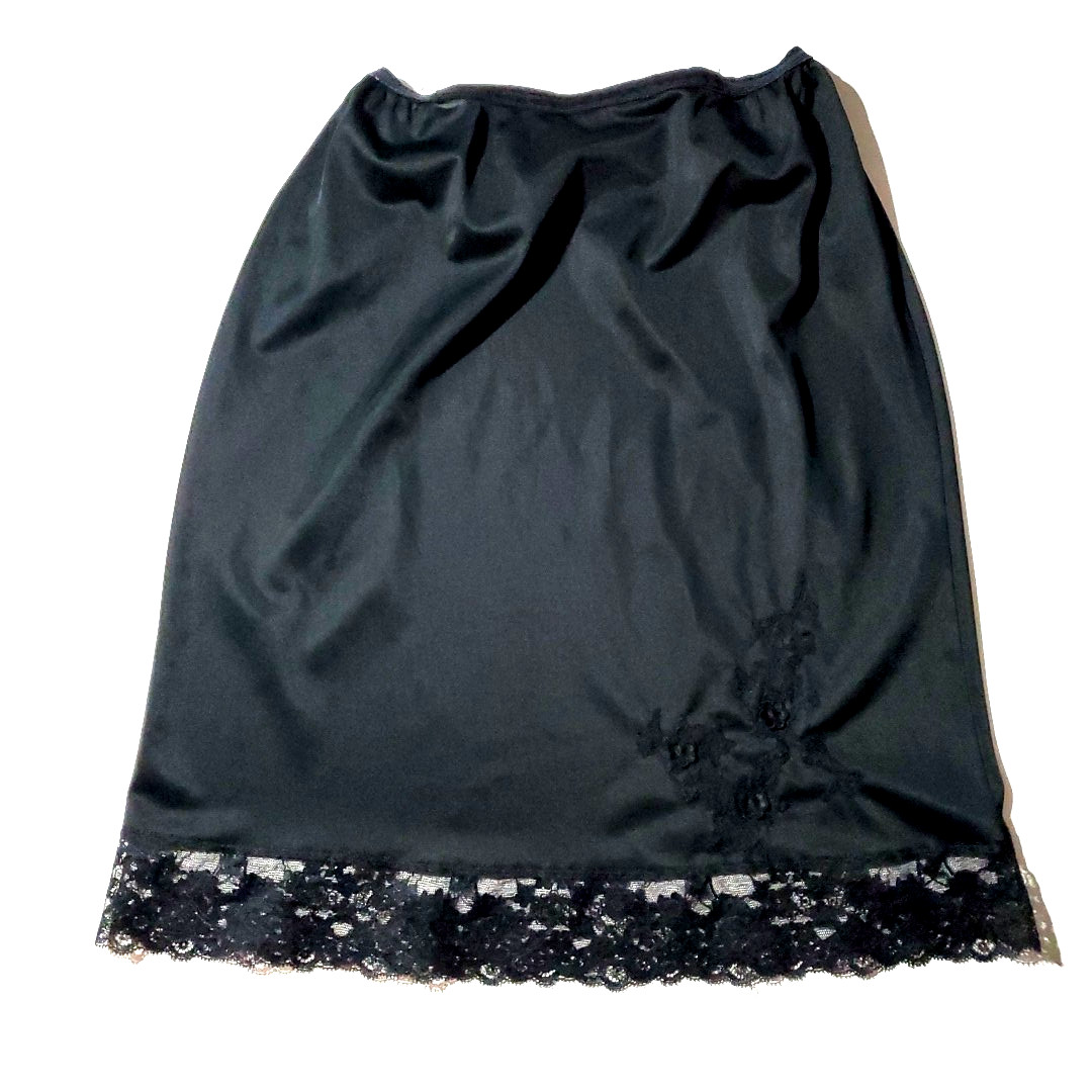 Vintage Half Slip Skirt BLACK SATIN Silky Nylon Lacey Floral Lingerie S / XS