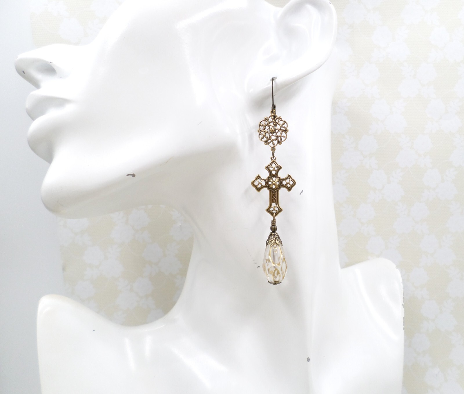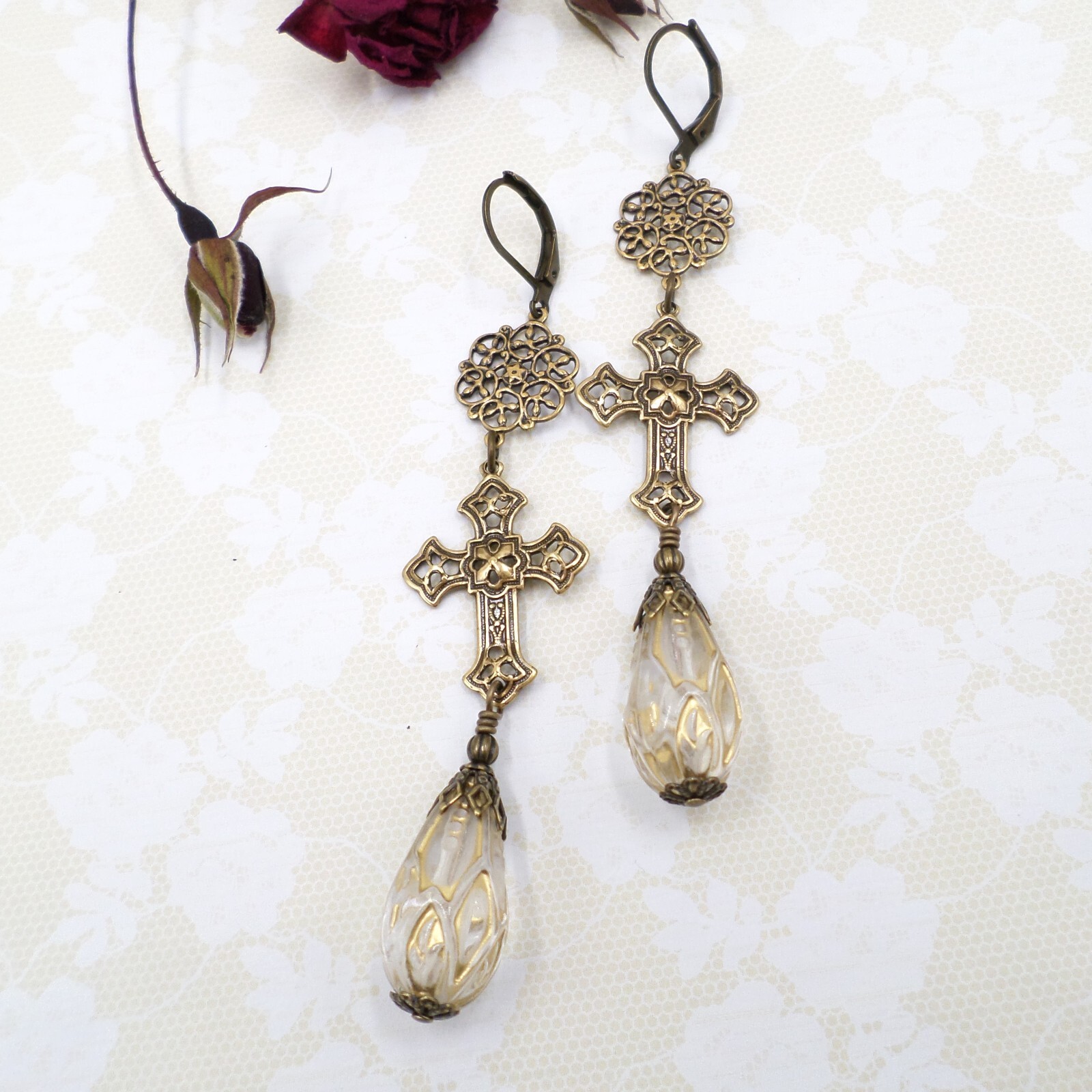 как выглядит Victorian Goth Brass Filigree Cross Long Earrings with Acrylic Beads фото