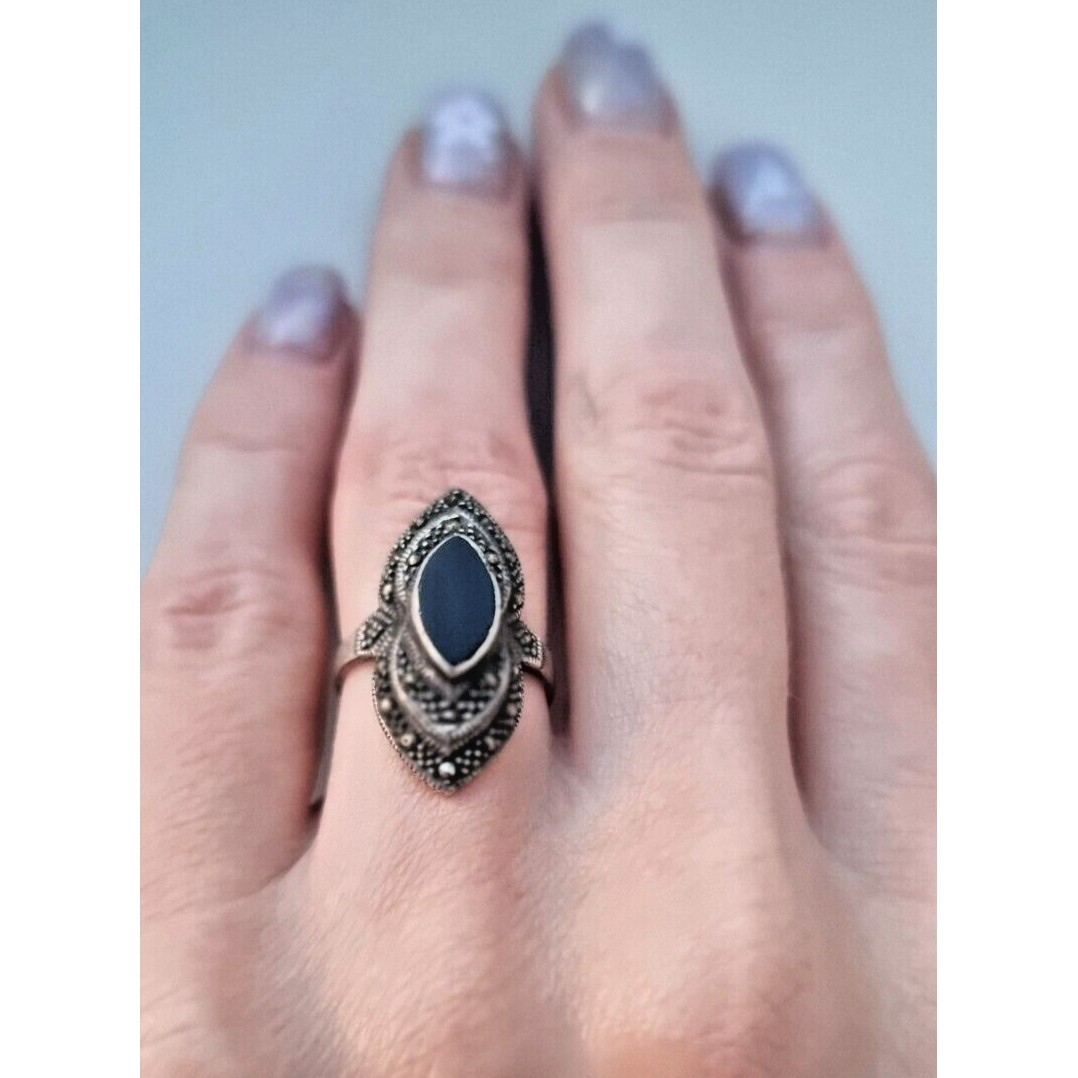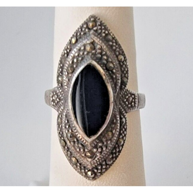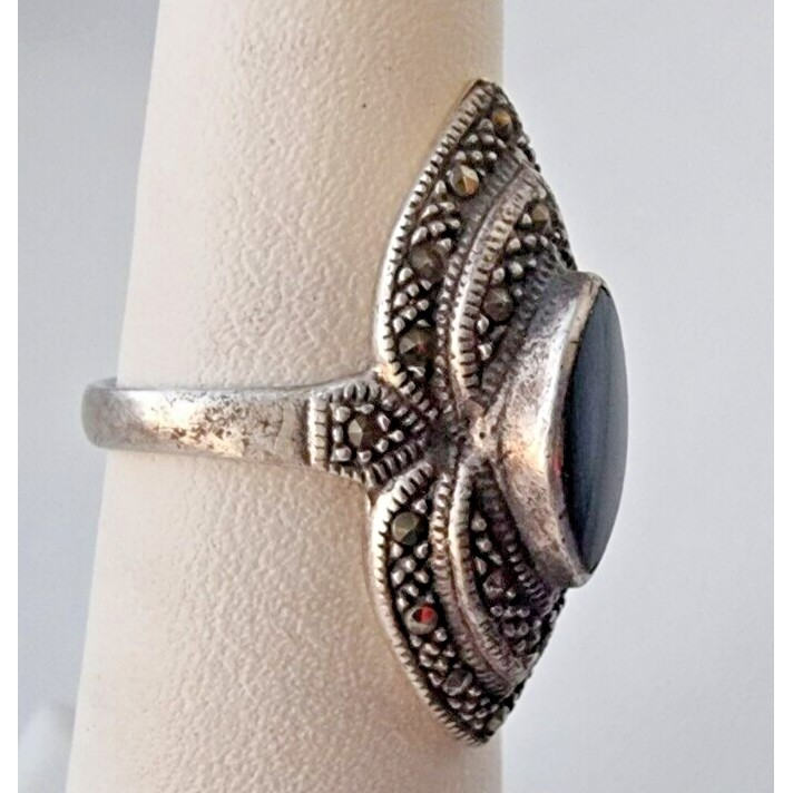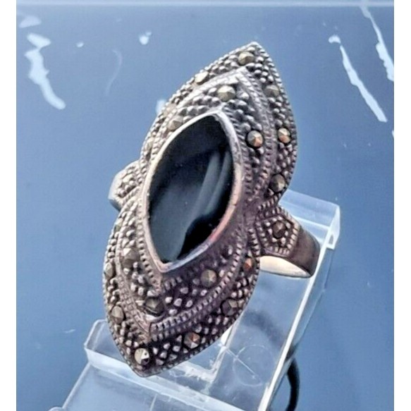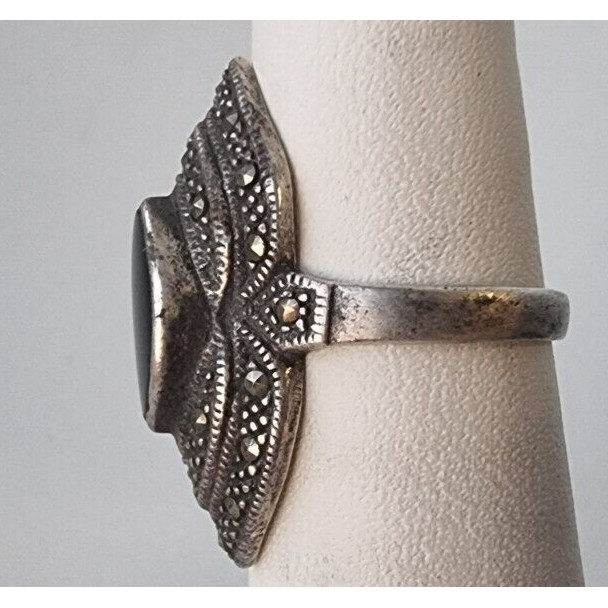 как выглядит 925 STERLING SILVER BLACK ONYX AND MARCASITES RING SIZE 5 AT фото