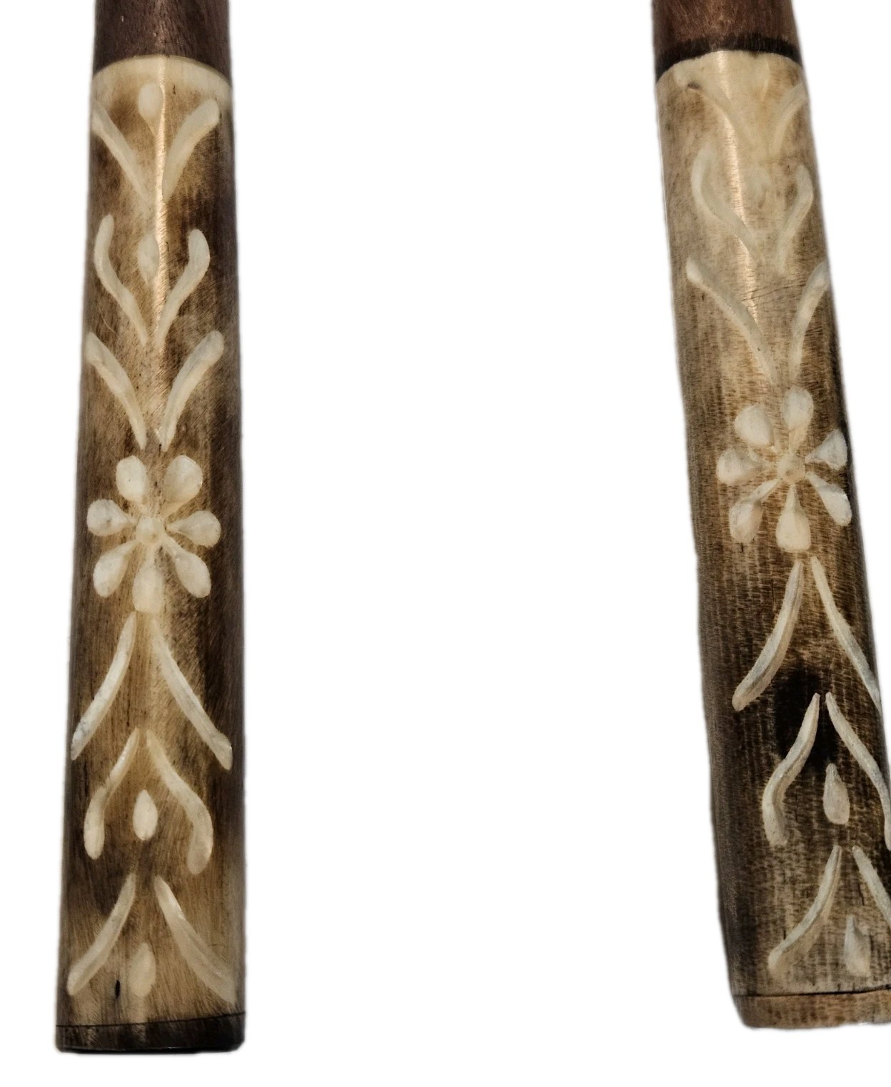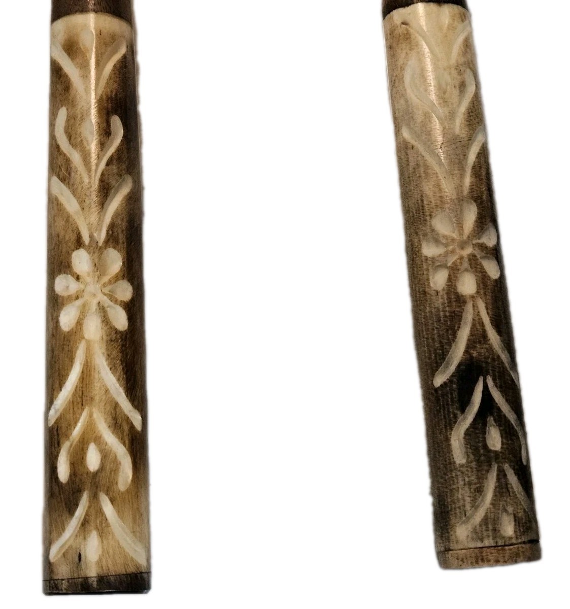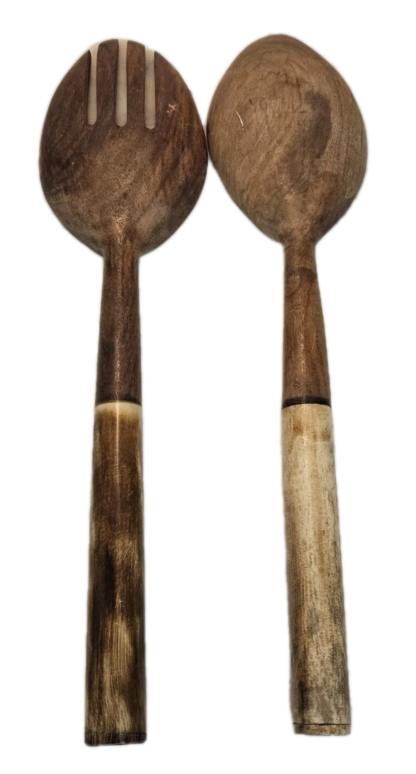 Vintage Handcrafted Wooden Salad Servers with Floral Carved Bone Handles -...