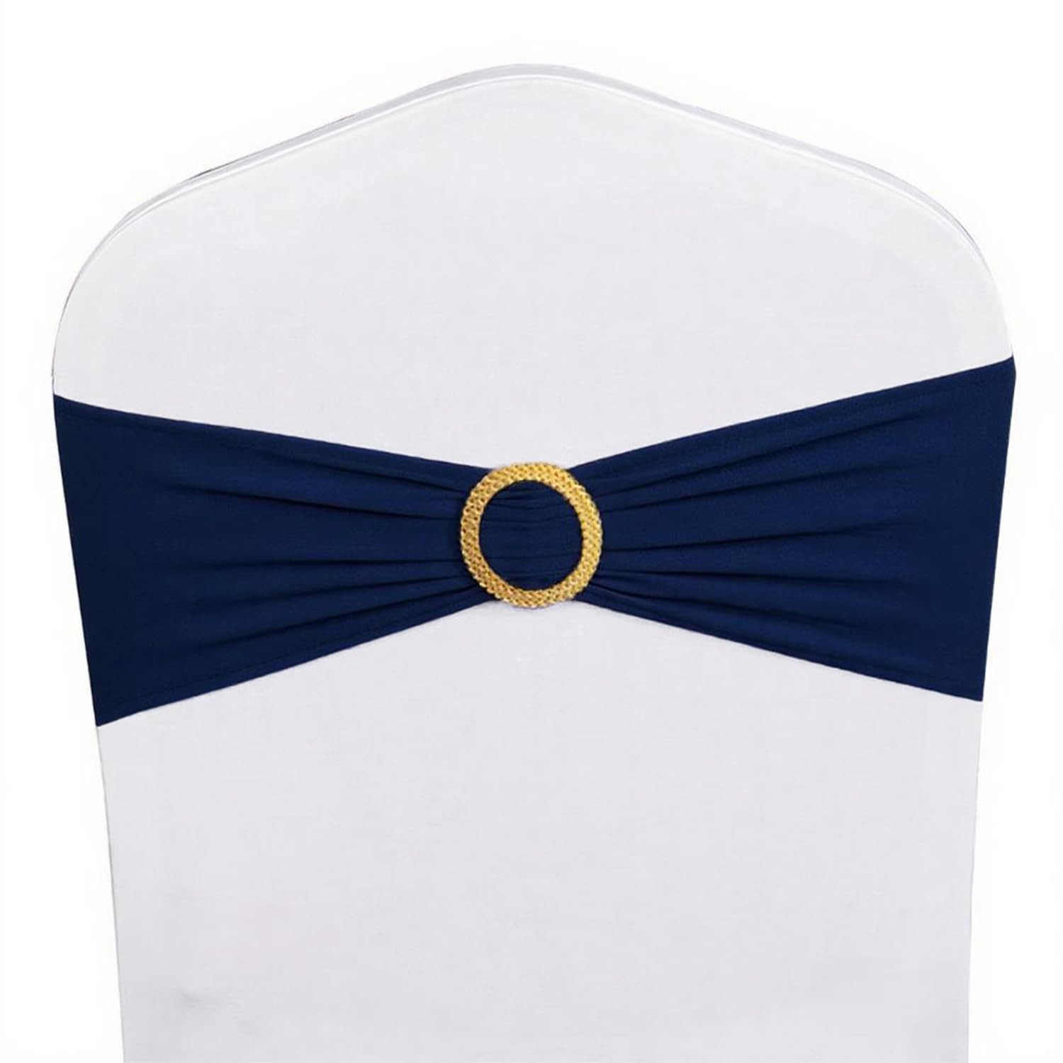 50 Pack Spandex Navy Blue Chair Sashes With Gold Buckles Stretch Bands Bows
