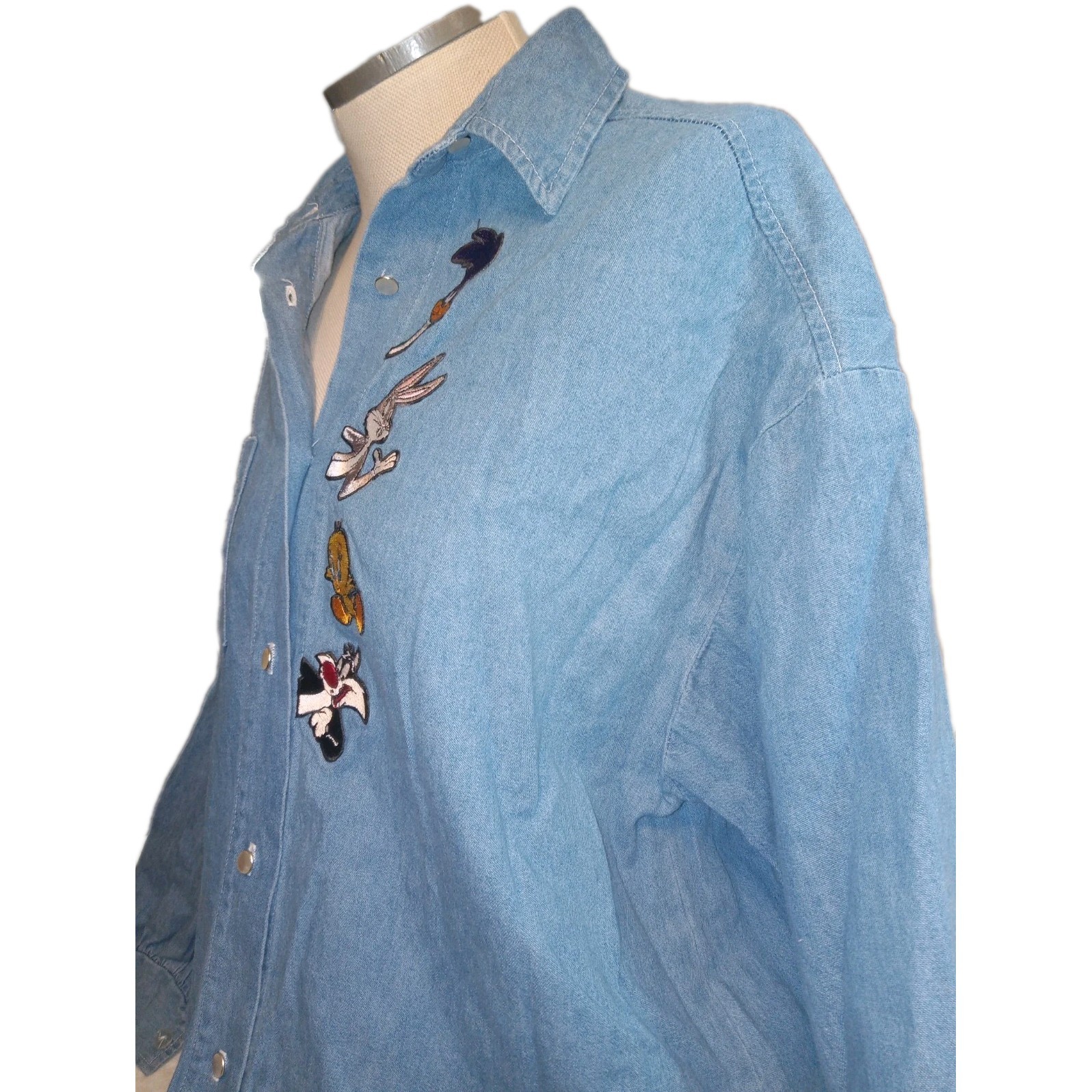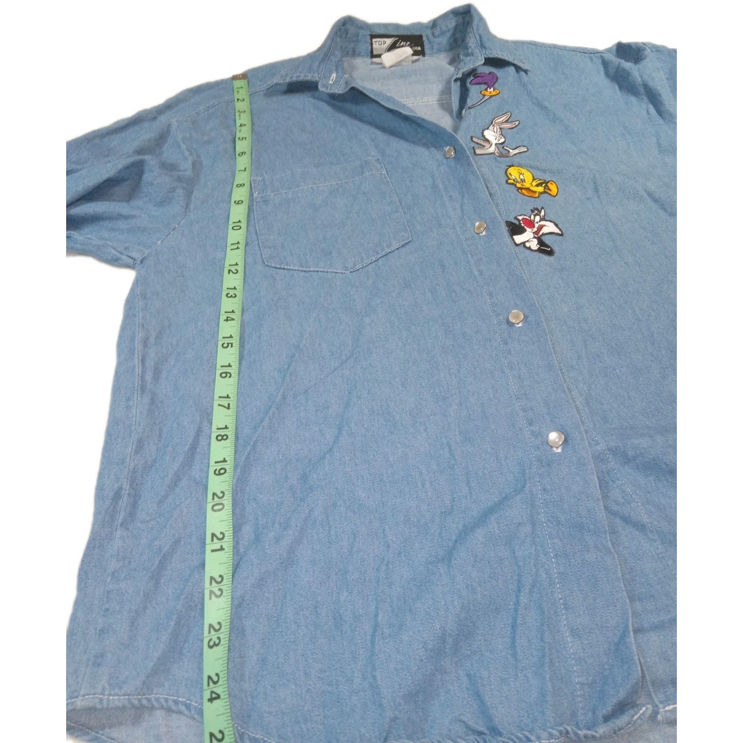 VTG 90s Denimn Shirt Looney Tunes Top Line USA Womens M Embroidered Pearl Button