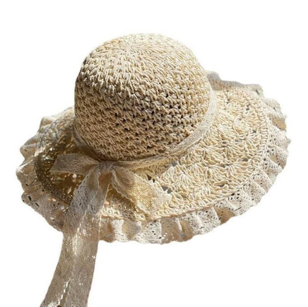 Women Sun Hat Floppy Wide Brim Lace Beach Cap UPF 50 Foldable Straw Travel